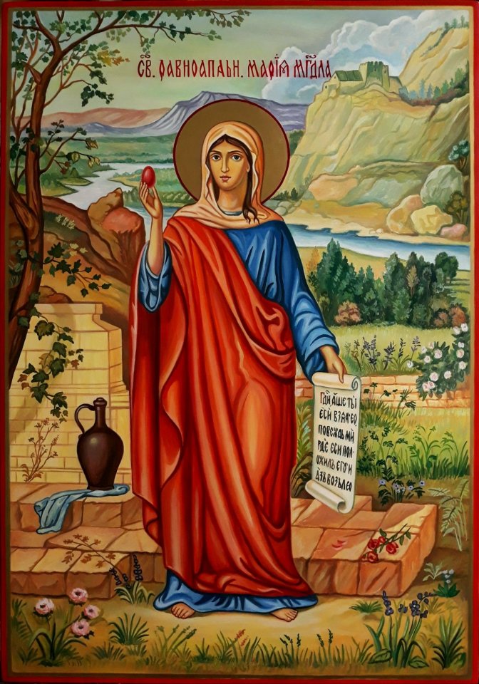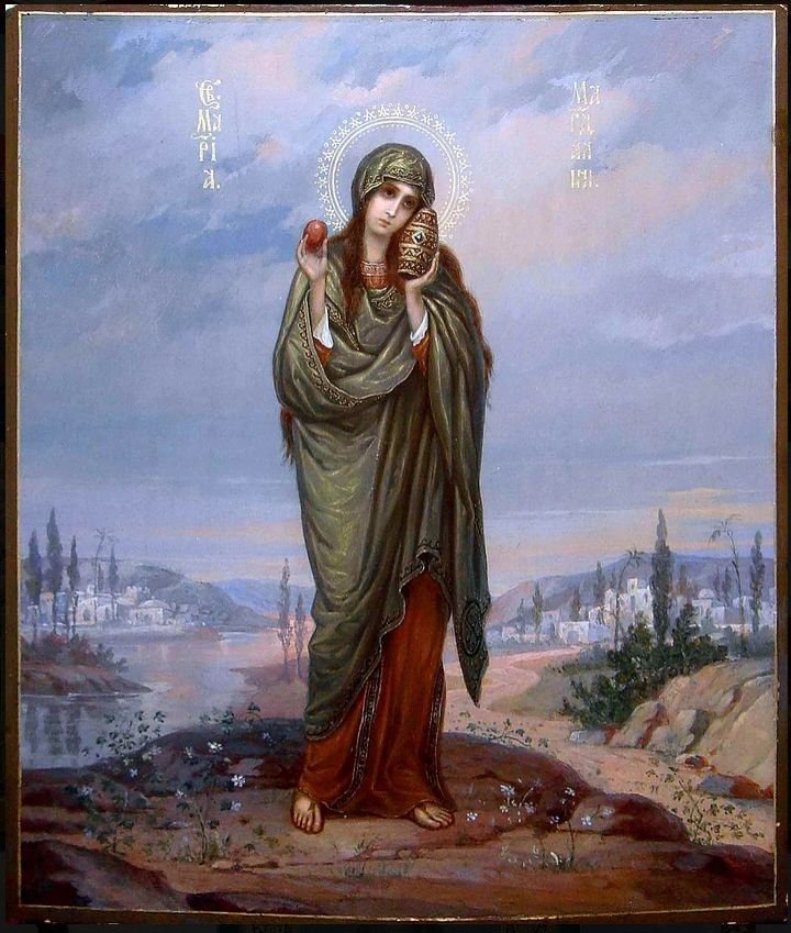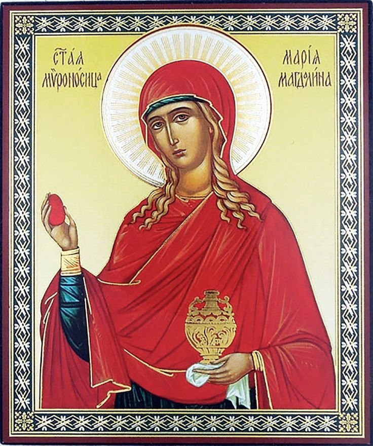 Св. равноапостольная Мария Магдалина, исцелённая Христом от беснования (Лк.8:2), стала верной последовательницей Спасителя. Она присутствовала при Распятии, погребении и первой удостоилась увидеть Воскресшего Господа (Ин.20:11-18). По преданию, проповедовала в Риме, где поднесла императору Тиверию красное яйцо со словами "Христос воскрес!", положив начало пасхальной традиции. Затем помогала апостолу Иоанну в Ефесе, где и скончалась. Её мощи хранятся во Франции, на Афоне, в Иерусалиме. В России частица святых мощей покоится в мужском монастыре во имя Святых царственных страстотерпцев (Екатеринбург).
