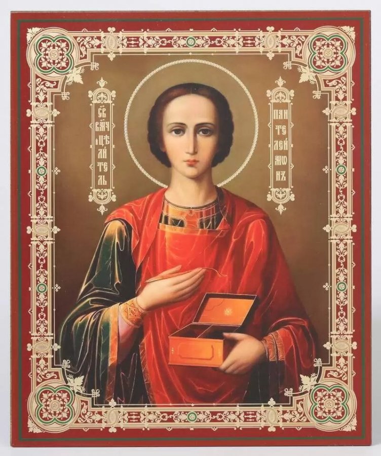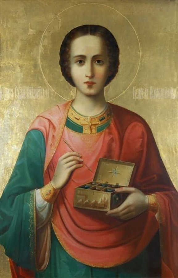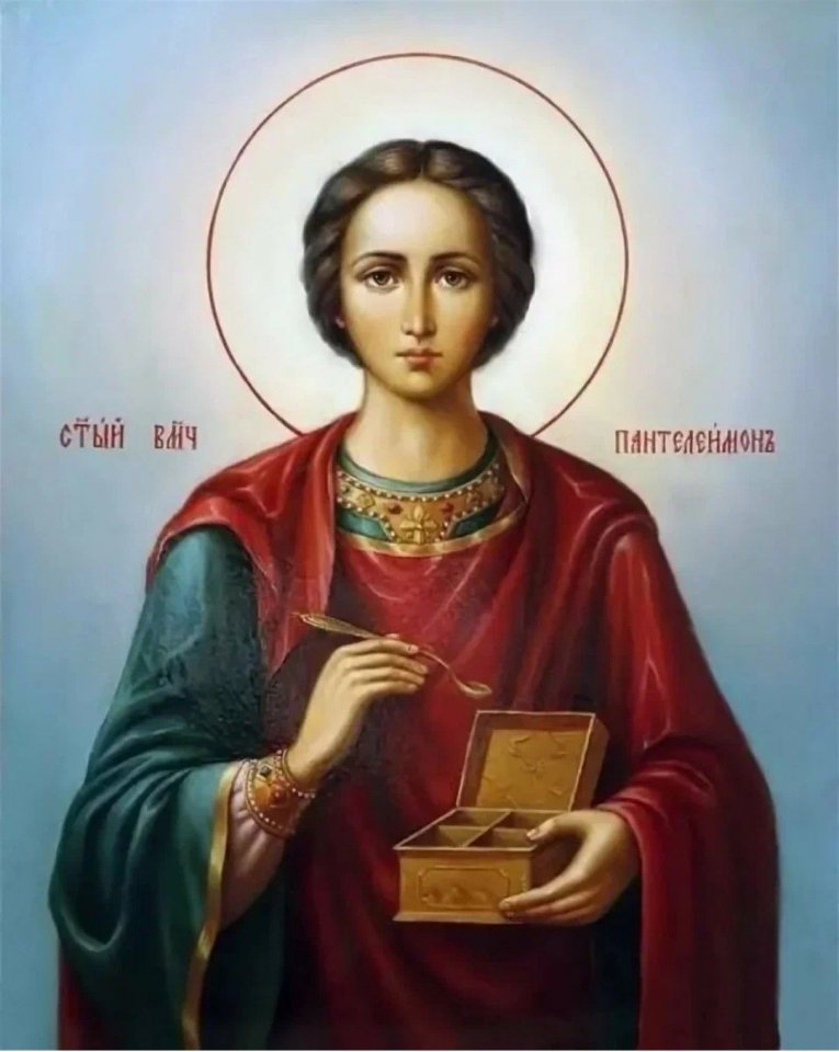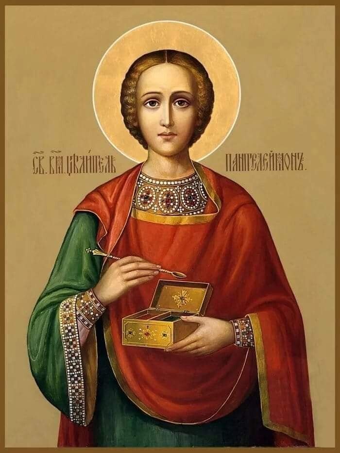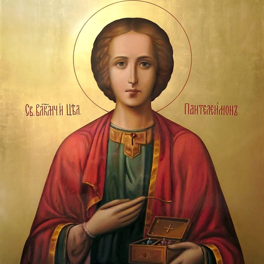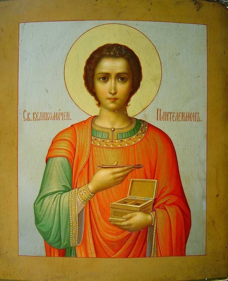 Великомученик Пантелеимон (первоначально Пантолеон) родился в Никомидии в семье язычника Евсторгия и св. христианки Еввулы. Обучался врачебному искусству, под влиянием священника Ермолая принял христианство. Крестившись, исцелил слепого, чем обратил в христианство своего отца. Бескорыстно лечил больных именем Христа, за что был предан императору Максимиану. Претерпел жестокие пытки (колесование, кипящее олово, растерзание зверями), оставаясь невредимым. Перед казнью Господь назвал его Пантелеимоном ("многомилостивый"). При усечении мечом из его раны истекли кровь и молоко. Мощи святого, особенно глава на Афоне, прославились многочисленными чудесами.