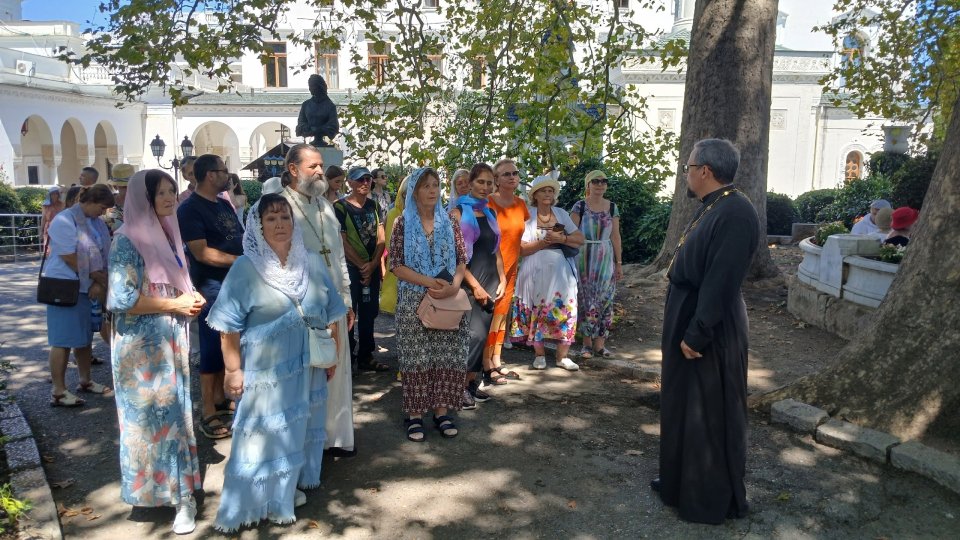 Наш путь лежал в Ливадийский дворец с Крестовоздвиженской церковью, в которой происходили очень важные события в жизни Царской семьи: принятие Православия святой мученицей, императрицей Александрой Федоровной Романовой через миропомазание, отпевание императора Александра III, здесь был зачитан Манифест о вступлении на Царский престол последнего в России царя – страстотерпца Николая II Романова.