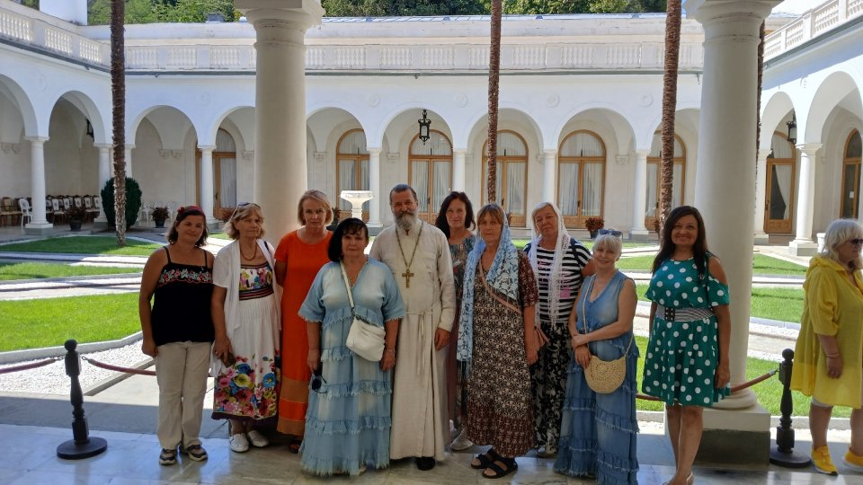 Далее для победителей фестиваля провели экскурсию по Ливадийскому дворцу с подробным рассказом о жизни Царской семьи в Крыму, с рассказом о предметах мебели и быта, им принадлежащим. Все участники поездки, люди творческие, талантливые, отметили, насколько важно то, что здесь представлены подлинные предметы, среди которых жили, пользовались ими, прикасались к ним царственные мученики, а также другие представители семьи Романовых. Наши русские музеи тем и отличаются от иностранных – подлинными доказательствами, предметами, реальными свидетельствами жизни исторических деятелей, событий истории нашей России. Это отмечают и иностранцы, посещая нашу страну и бывая в наших музеях. А в Ливадии не просто жили исторические деятели, здесь жили наши русские святые – члены Царской семьи Романовых, стяжавших мученические венцы в подвале Ипатьевского дома в Екатеринбурге, где теперь построен Храм -на-крови.