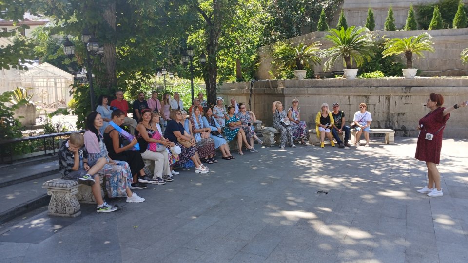Прогулка по парку среди деревьев, свидетелей жизни Царской семьи, где высажено огромное количество прекрасных роз, разных сортов и оттенков, как это было при жизни Царской семьи, памятник Александру III и стелла с достижениями России накануне революции дополнили впечатление от увиденного в Ливадийском дворце.