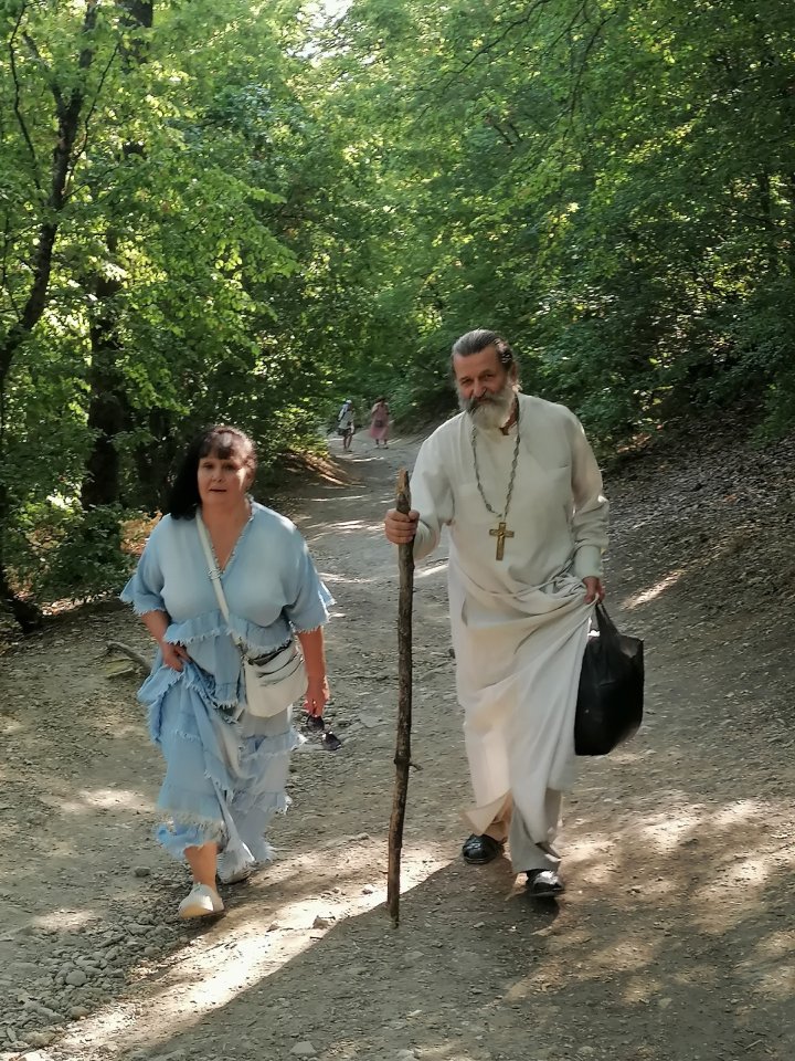 Счастливые посветлевшие лица паломников, ласковые монастырские коты, гроздья созревшей бузины, солнечные лучи, пробивающиеся сквозь густые кроны деревьев... О. Сергий позвонил в колокола, и все отправились в обратный путь. Под гору уже легко и весело!