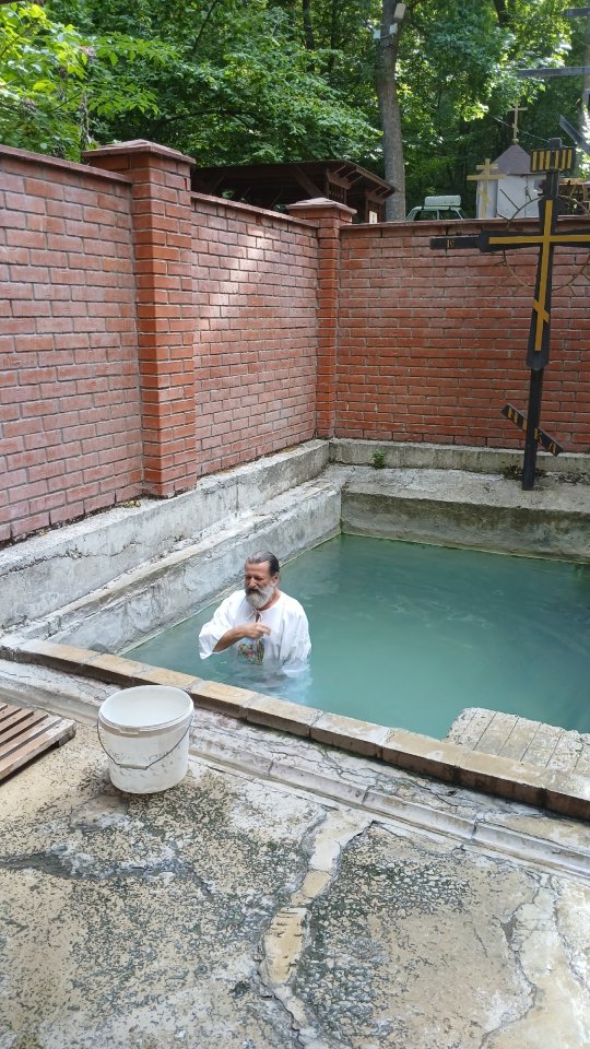 Отдельные купальни – для мужчин и женщин. Вода градусов 12. Разгоряченные подъемом в гору по лесной тропе, все с радостью погружались в холодную воду с молитвой "Во имя Отца — Аминь! И Сына — Аминь! И Святого Духа — Аминь! " — и радостно выскакивали из источника, давая путь другим.