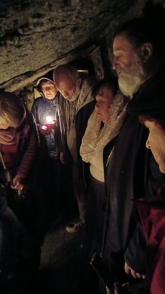 По живописной лесной дорожке, вдоль которой зацвели голубые пролески, прошли к святой пещерке, вырытой и намоленной в течение 10 лет монахиней Параскевой (болгаркой Константиной), с которой в 19 веке начался монастырь. Там все помолились и поставили свечи.