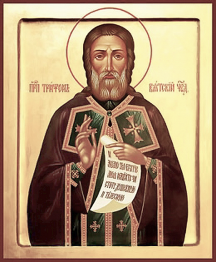 Преподобный Трифон, архимандрит Вятский, происходил от благочестивых родителей, живших в Архангельской губернии. Когда родители захотели женить Трифона, то он, с юных лет чувствуя призвание к иноческой жизни, тайно ушел из дома в город Устюг, где поселился у приходского священника, все время пребывая в строгом посте и молитве. Затем он жил в городке Орлеце около церкви, перенося холод и голод, а оттуда перешел в Пыскорскую обитель на реке Каме. Здесь преподобный Трифон приобщился к монашеской жизни и принял постриг от игумена Варлаама. 22-летний монах не пропускал ни одной церковной службы и нес тяжелое послушание в пекарне. Когда он тяжело заболел, ему явился святитель Николай и, исцелив его, укрепил в подвиге.