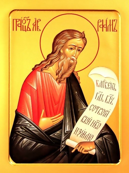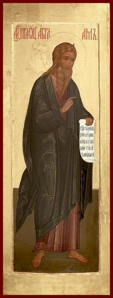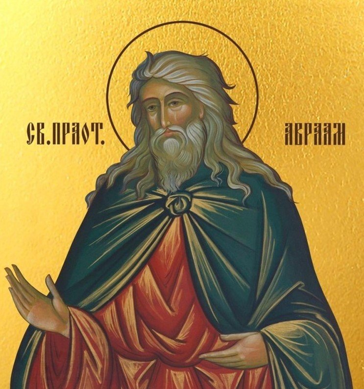 Ве́лию ве́ру показа́вый к Бо́гу, Авраа́ме, пре́жде обре́зания,/ на со́лнечно ме́сто под дуб всели́лся еси́ странноприи́мствовати/ ку́пно с честно́ю ти Са́ррою./ Те́мже и трисо́лнечное вели́чество всея́ Боже́ственыя Тро́ицы обра́зно зре́ти сподо́билися есте́,/ и богода́нное ча́до прия́ли есте́./ И во странноприи́мства ме́сто во све́те немерца́ющем нам, необре́занным всех стран язы́ком,/ ве́рующим во Святу́ю Тро́ицу, прии́мник/ и ве́рою оте́ц от Бо́га наре́клся еси́, Авраа́ме./ Моли́те ку́пно Святу́ю Тро́ицу о нас, ве́рующих в Ню,// да обря́щемся в све́тлостех ва́ших.