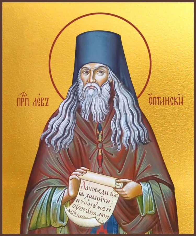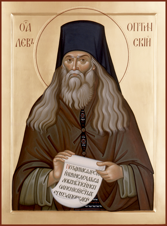 О, Пречестна́я богому́драя главо́ и собо́ра Ста́рцев О́птинских изря́дное и перволепное украше́ние, богопросвеще́нне о́тче Льве́! Тебе́, я́ко ча́да отцу́, дерза́ем приноси́ти сие́ ака́фистное пе́ние, ты́ же не пренебрези́ ма́лаго сего́ приноше́ния, я́ко па́че до́лжни мы́ не то́кмо пе́нии, но де́лы тя́ почестви́ти. Ты́ бо оста́вил еси́ на́м бога́тство твоего́ жития́ богоуго́днаго, в не́мже я́ко в зерца́ле зри́тся о́браз богоше́ственных отце́в в по́двизе Бо́гу угоди́вших.