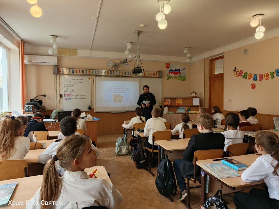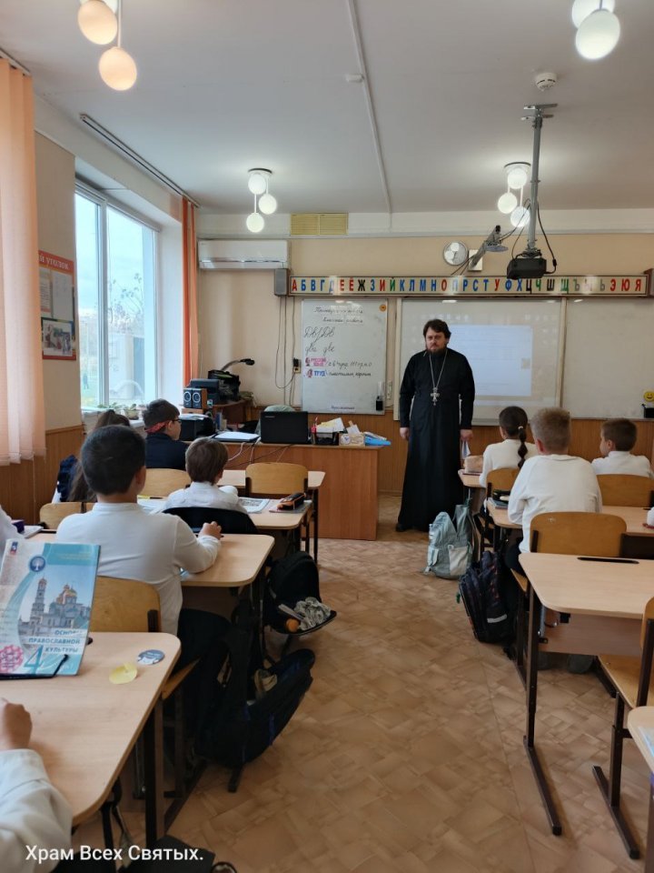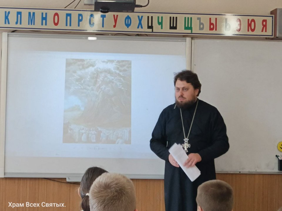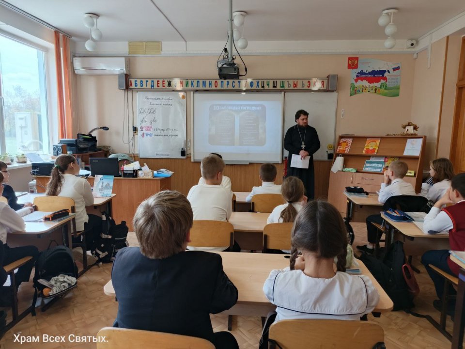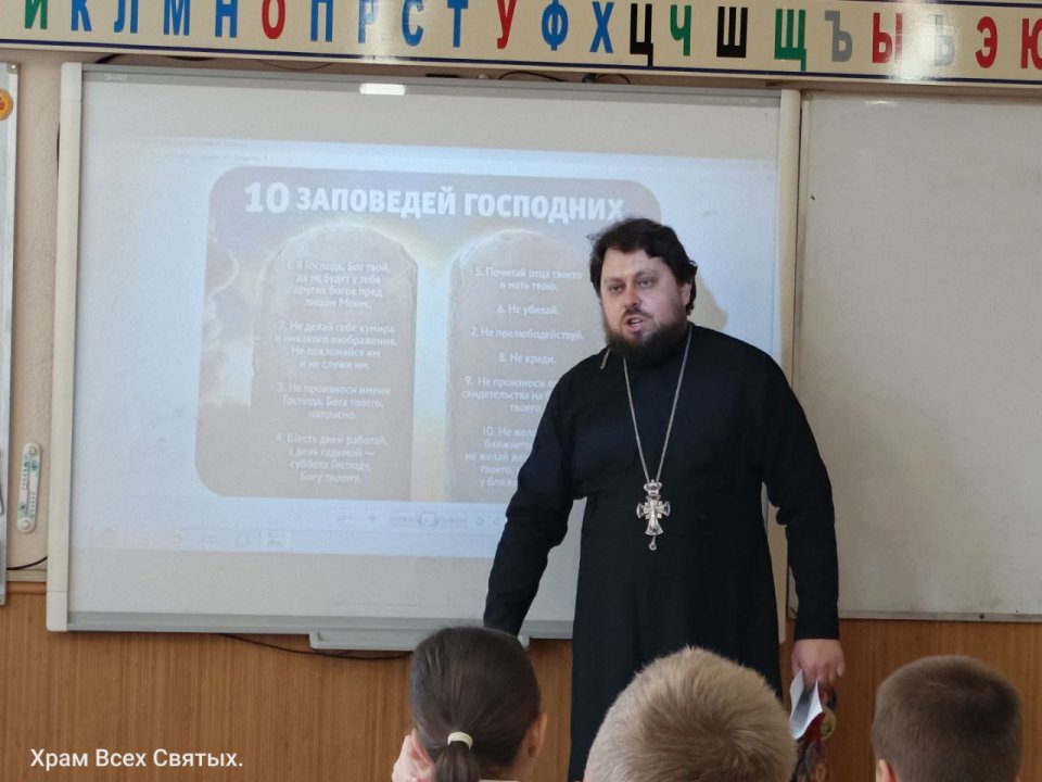 Клирик храма Всех Святых протоиерей Сергий Климачев посетил среднюю школу №45, где провел урок в 4-м классе для детей, изучающих курс «Основы православной культуры». На занятии говорили с ребятами о Десяти заповедях Божиих и особенно рассмотрели 5-ю заповедь, посвященную почитанию родителей и взрослых.