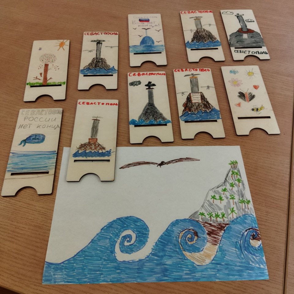 Вместо традиционной поделки сегодня ученики мастерили подарки для солдат. На вручную выточенных дощечках для мобильных телефонов дети нарисовали символ нашего Богом хранимого города – памятник Затопленным Кораблям и написали вдохновляющие слова и пожелания.