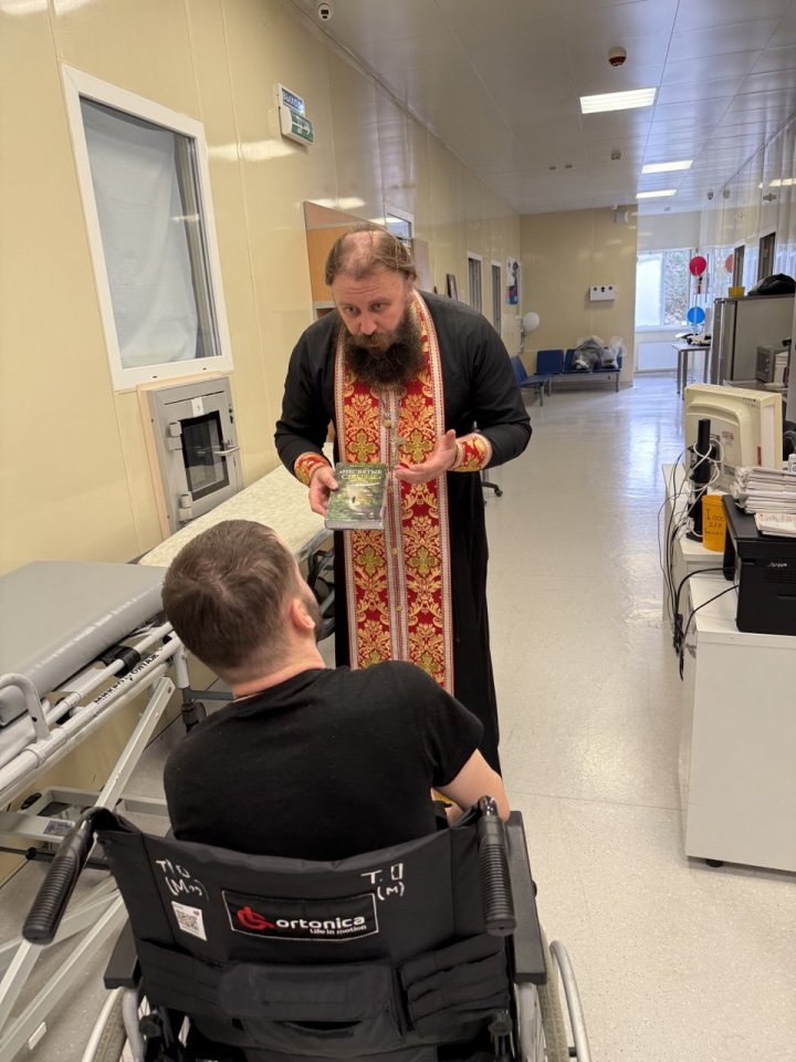 После трапезы клир храма, во главе с настоятелем, иереем Николаем Яковлевым, направился в военный госпиталь, где, по традиции, каждому выздоравливающему воину было преподано слово проповеди, срастворённое целебным кроплением святой воды и благодатным помазанием освященным елеем. Готовящиеся приступить ко Святым Таинам были исповеданы и приняли Святые Дары. Тем же, кто временно недвижим, был преподнесен лучший подарок – книга!