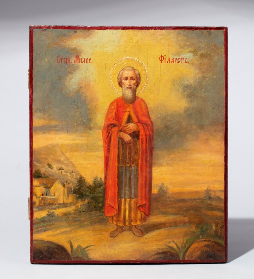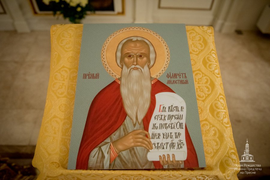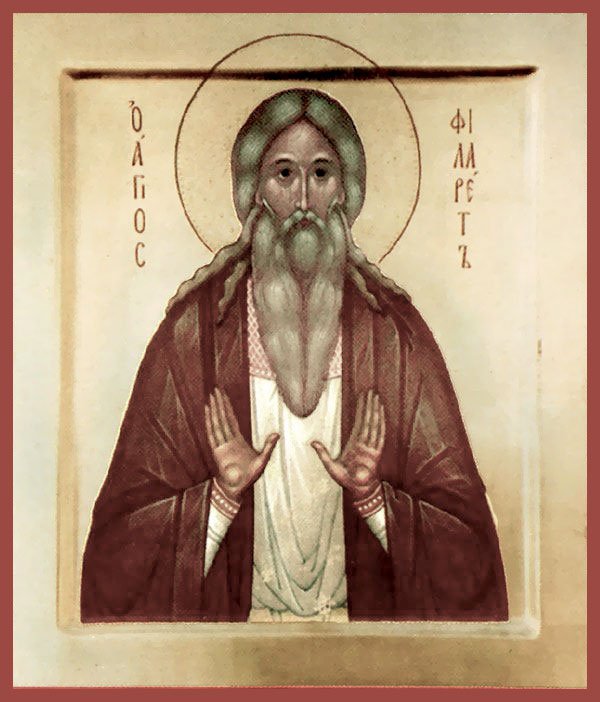 О, преди́вне избра́нниче Бо́жий, Филаре́те Ми́лостивый! А́мнии преще́дрый хлебода́телю, Правосла́вия свети́льниче, Го́спода Бо́га ра́бе благи́й и ве́рный! Ты́ бо все́м се́рдцем ева́нгельски Христу́ после́довавый и да́нный тебе́ тала́нт прему́дре умно́живый: си́рых и убо́гих оде́явый и напита́вый; стра́нных и ни́щих в до́м сво́й введы́й, в ско́рбех и печа́лех су́щих уте́шивый, уме́рших и на сто́гнах пове́рженных гро́бу преда́вый; все́м вся́чески послужи́вый, и та́ко ве́ру свою́ в дела́х показа́л еси́.