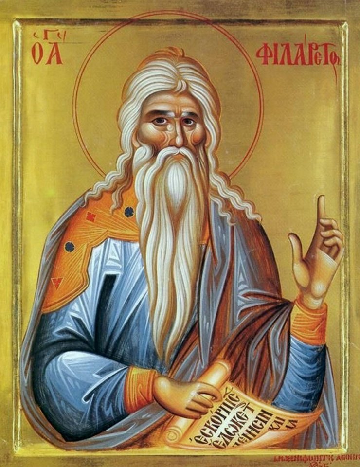 Праведный Филарет Милостивый, сын Георгия и Анны, воспитанный в благочестии и страхе Божием, жил в VIII в. в селении Амнии Пафлагонской области (Малая Азия). Жена его, Феозва, была из богатой и знатной семьи, у них были дети: сын Иоанн и дочери Ипатия и Еванфия.
