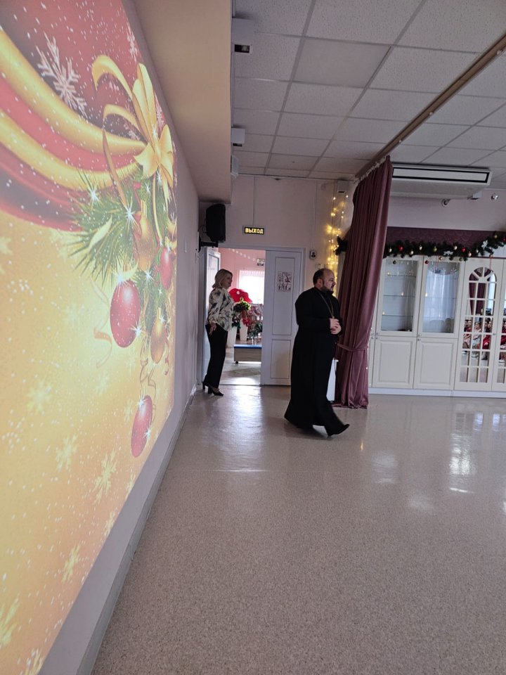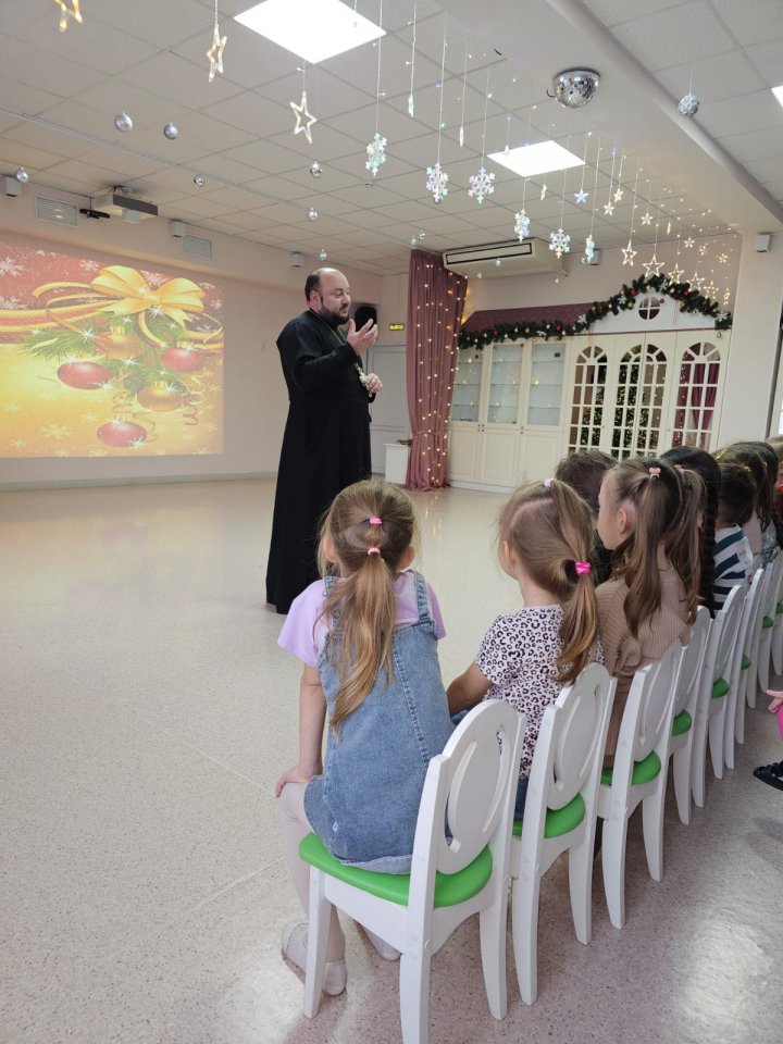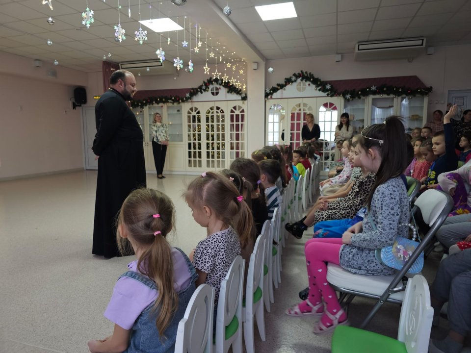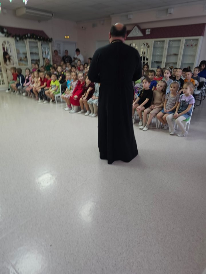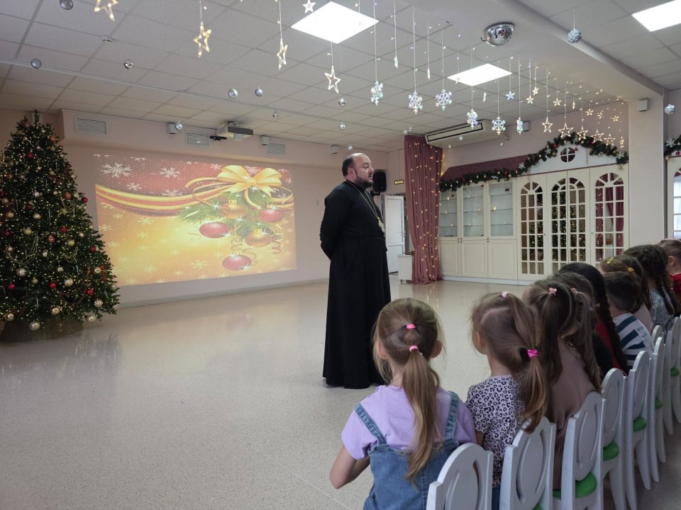 Отец Игорь доступно рассказал деткам о жизни и чудесах святого Николая, а также о грядущем Новолетии и Рождестве Христовом. Завязался дружеский разговор, за которым дети задавали вопросы и сами отвечали на вопросы батюшки.