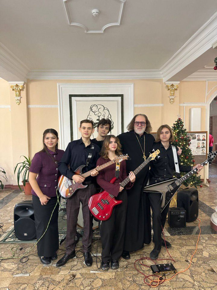 Священник Центрального благочиния поучаствовал в выступлении рок-группы 1-й гимназии в честь праздника святителя Николая Чудотворца