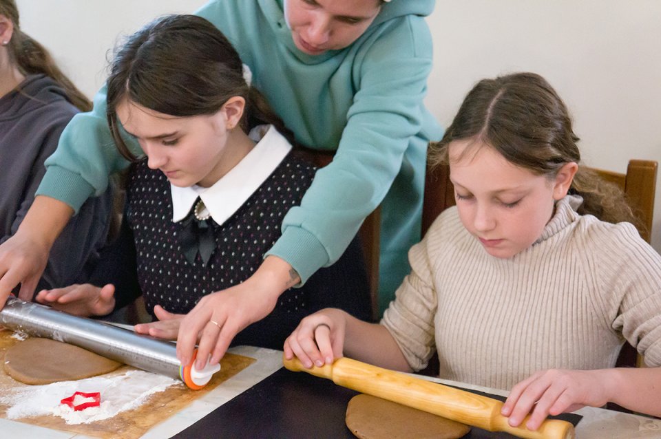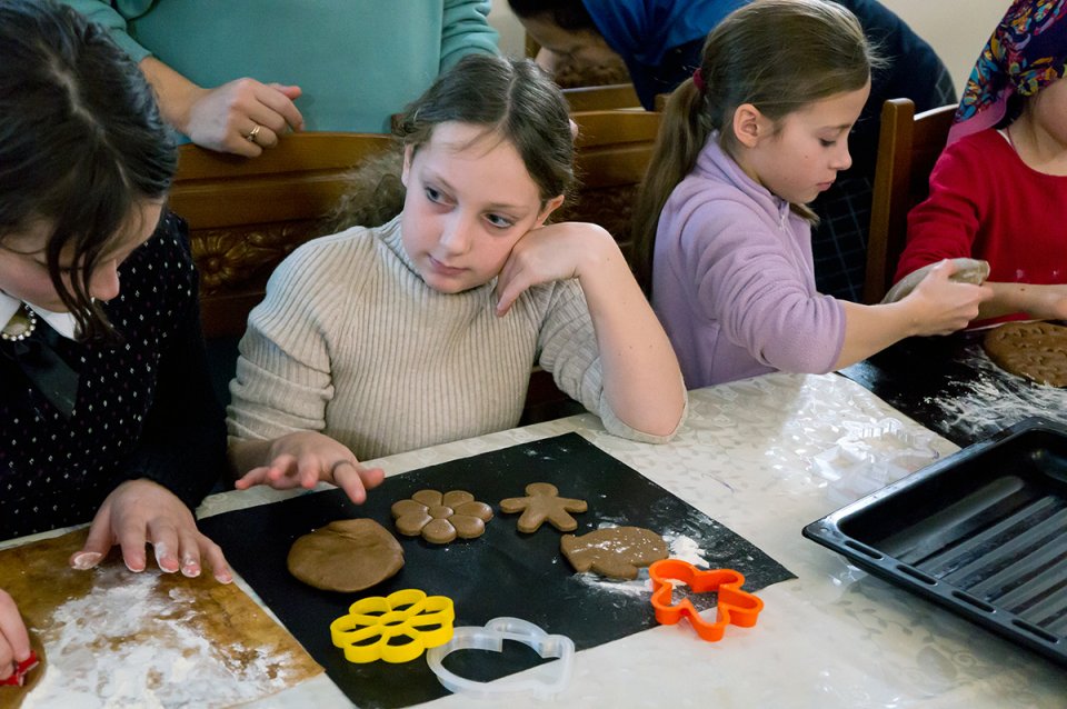 После воскресной Божественной литургии, которую возглавил настоятель протоиерей Игорь Тышкевич, ребята старшей и младшей групп воскресной школы, вместе с мамами, собрались в трапезной храма, куда мама самой младшей воспитанницы школы вместе дочкой пригласила всех на мастер-класс по изготовлению имбирного печенья. Ребята послушали об этапах подготовки и замешивания теста; нетерпеливые малыши еле дождались, когда девочки старшей группы приготовят тесто, и наконец, все расселись по местам, выбрали формочки и приступили к самому интересному процессу – вырезанию фигурок и выпечке. Никто не боялся испачкать руки, от 2-х летней малышки до взрослых, которые увлеклись процессом, и вскоре пряный, сдобный аромат разнесся по трапезной... Приготовленные имбирные печенья ребята бережно упаковали в пакетики, ведь впереди их ждет не менее «вкусный» урок по росписи!