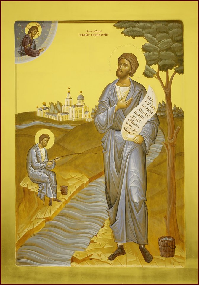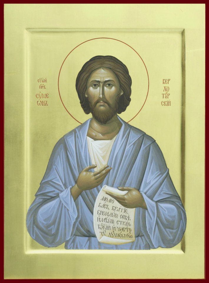 О, святы́й и пра́ведный Симео́не, чи́стою душе́ю твое́ю в Небе́сных оби́телех в ли́це святы́х водворя́яйся, на земли́ же с на́ми неотсту́пно пребыва́яй! По да́нней ти благода́ти от Го́спода моли́тися о нас, ми́лостивно при́зри на нас многогре́шных, а́ще и недосто́йне, оба́че с ве́рою и упова́нием к тебе́ притека́ющих, и испроси́ нам от Бо́га проще́ние согреше́ний на́ших, в ня́же впада́ем мно́жицею во вся дни жития́ на́шего.