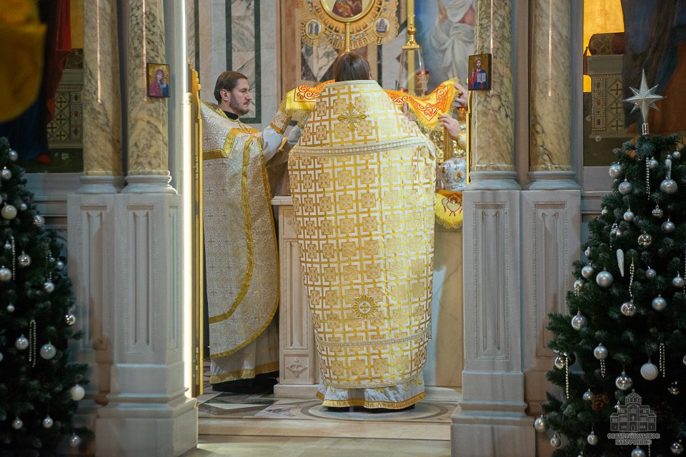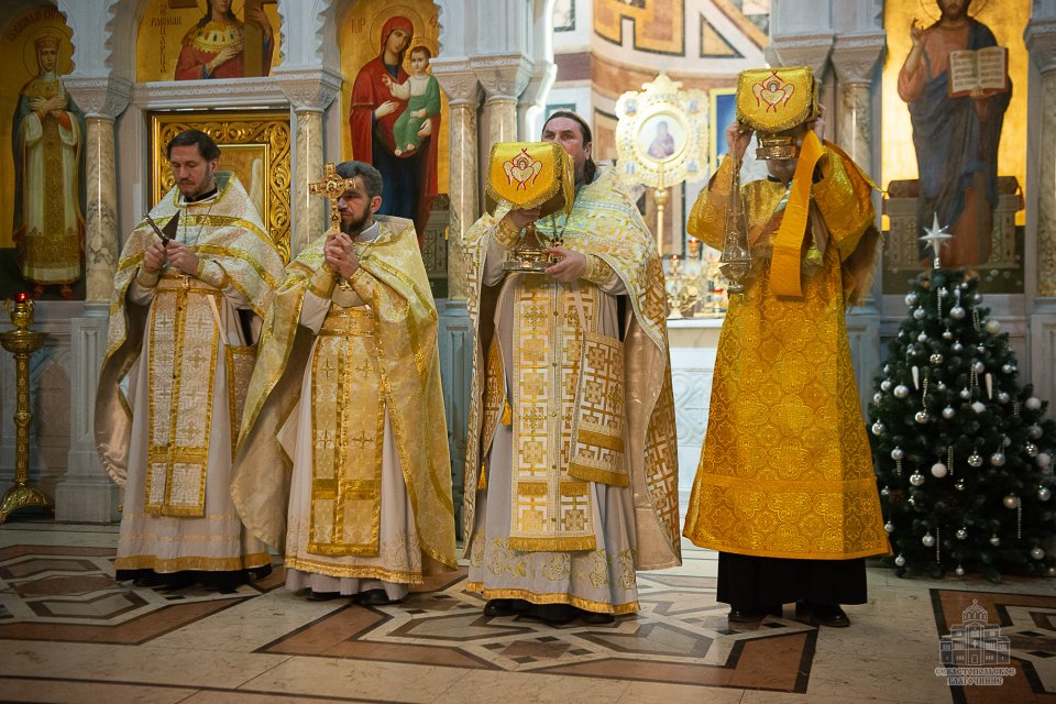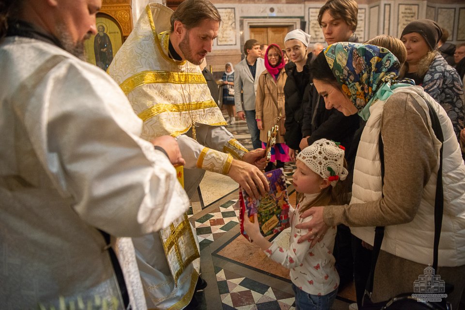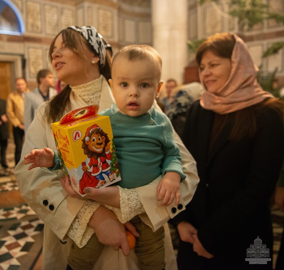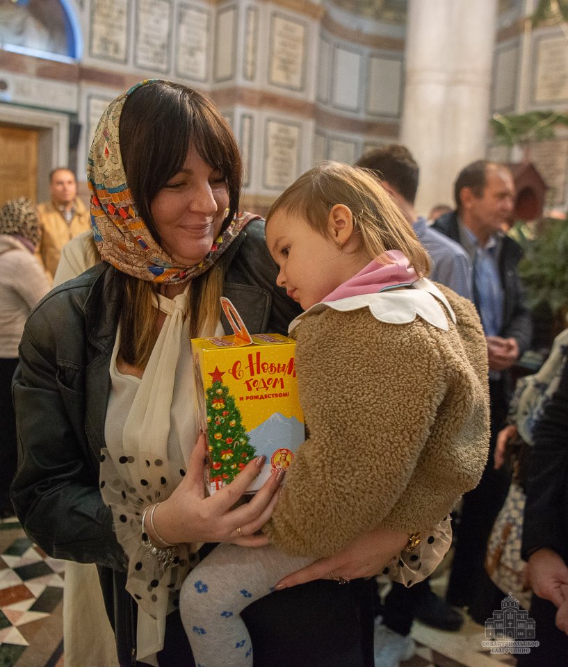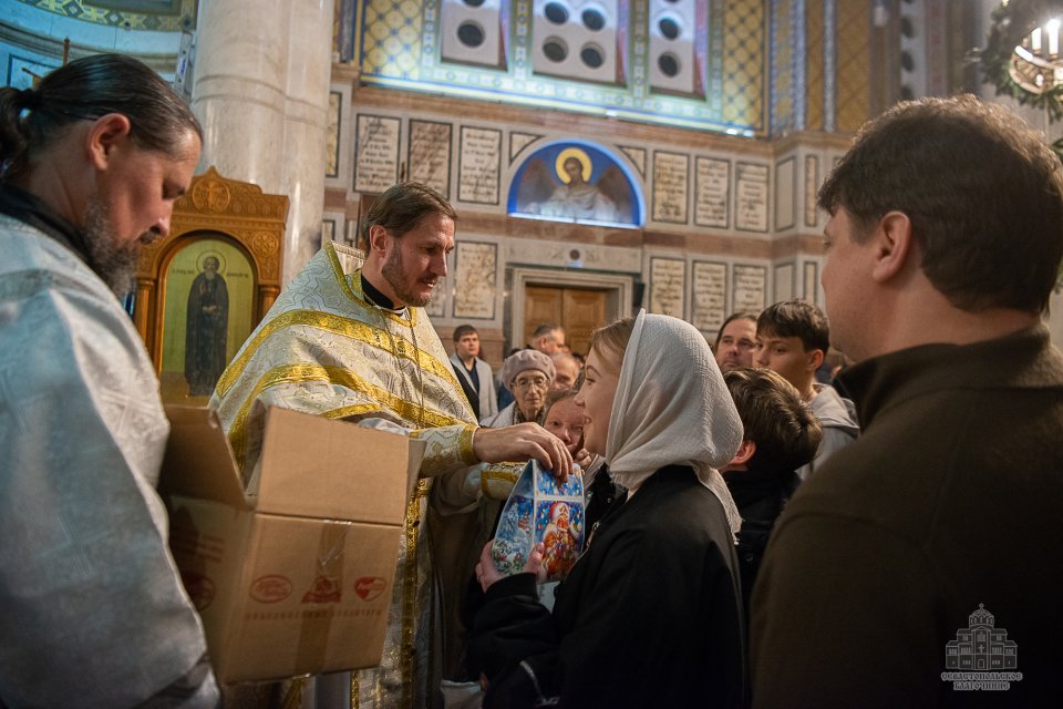 По окончании богослужения рождественскими колядками прихожан поздравил хор собора, подарив настоящую Рождественскую радость., а маленькие прихожане получили из рук батюшки сладкие подарки.