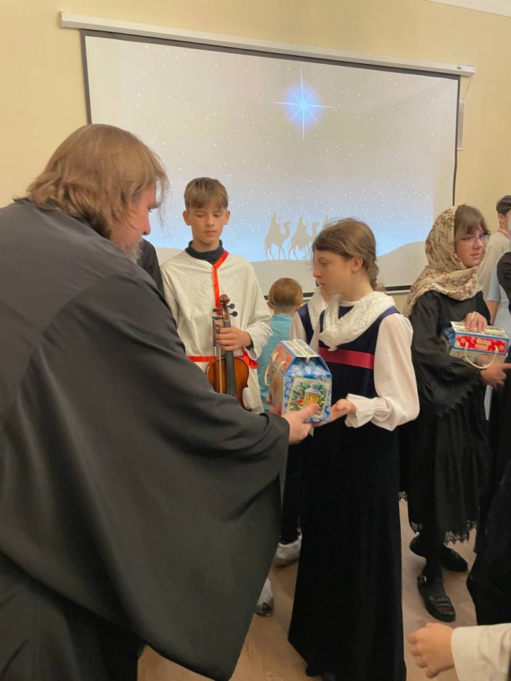 В завершение праздника настоятель собора протоиерей Сергий Халюта поблагодарил учителей и ребят за представление и вручил всем сладкие подарки. Дети, в свою очередь, приготовили для батюшки пряничный Рождественский домик, который с любовью испекли сами.