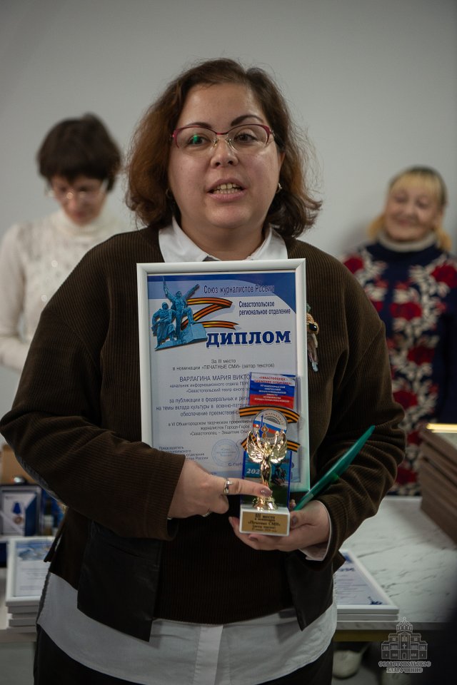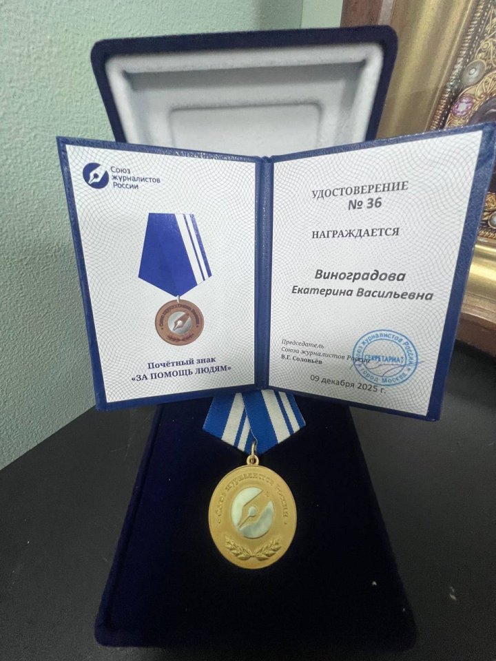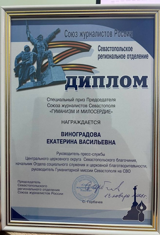 Руководитель пресс-службы Центрального благочиния Екатерина Виноградова, которая также является руководителем Гуманитарной миссии Севастополя, за неравнодушие к чужой беде, помощь фронту, а также за сохранение памяти о фронтовых днях в текстах и фотоснимках, была отмечена памятным знаком Союза журналистов России "За помощь людям", а также Специальным призом Председателя Союза журналистов Севастополя "Гуманизм и милосердие".