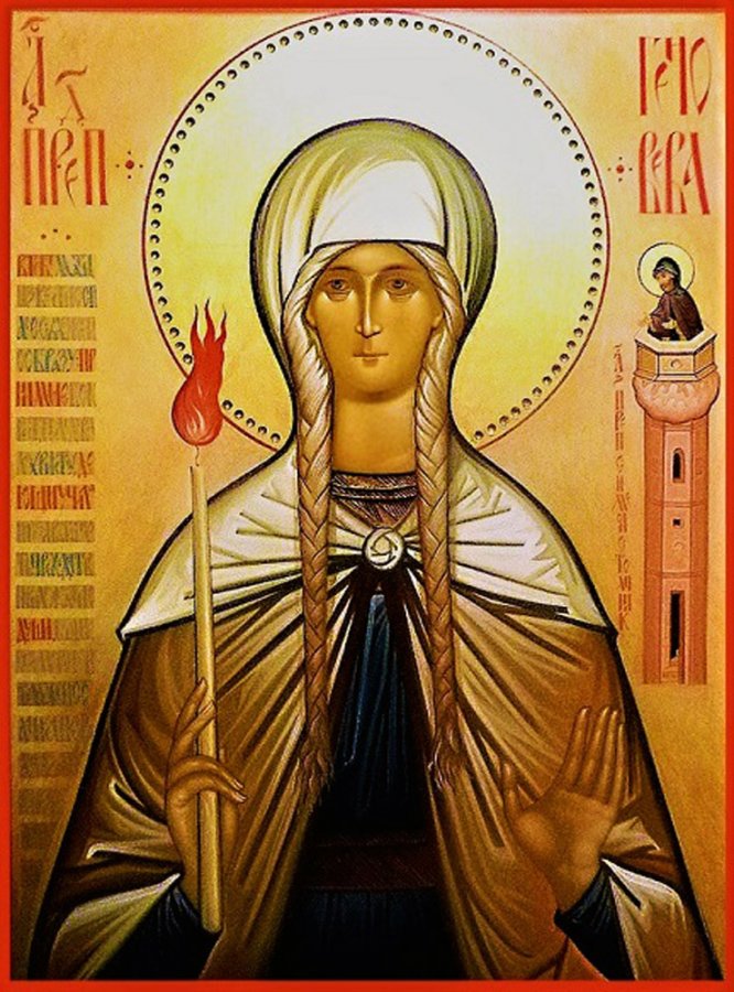 Пла́менная ве́ры и́стинныя провозве́стница/ и гра́да твоего́ засту́пница еси́,/ о свята́я ма́ти Генове́фо,/ изба́ви ны от паде́ний грехо́вных,/ и потре́бная блага́я ниспосли́, и гла́дныя напита́й,/ и Го́спода моли́ неуста́нно// о спасе́нии душ на́ших.