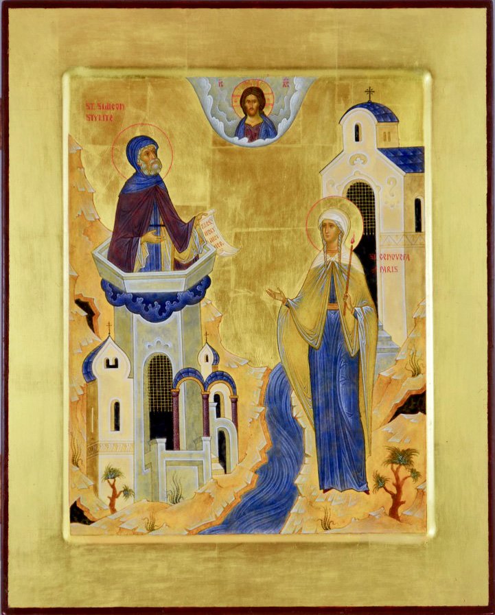 В это время на Востоке, в пустыне, недалеко от Антиохии, жил великий подвижник Симеон Столпник [прим.: прозванный так потому, что он сорок лет провел на столпе]. Патриархи испрашивали его совета в борьбе с ересями, к нему стекалось множество народа, тем более что путь с востока на запад проходил недалеко от столпа, на котором он стоял. Наставляя посещавших его, святой Симеон узнавал от них и о жизни Церкви Христовой. И каждый раз, когда, проходя этим путем, купцы из Парижа посещали его, он расспрашивал их о святой Геновефе, передавал ей свое приветствие и просил ее молиться о нем. Провидел ли духом святой подвижник Востока, что в Галлии сияет святостью посвященная Богу дева, донеслась ли до его столпа молва о ней, не это в данном случае имеет значение. Но духовная, молитвенная связь между великим пустынником Востока и жившей среди мирян в большом западном городе простой, посвященной Богу, девой, образ святости которой так отличался от подвижнического пути святого Симеона, свидетельствует о единой в те времена на Востоке и Западе вере Христовой.