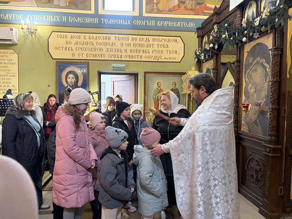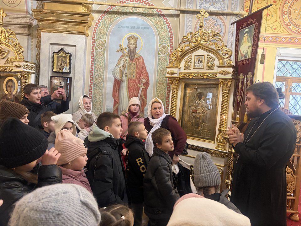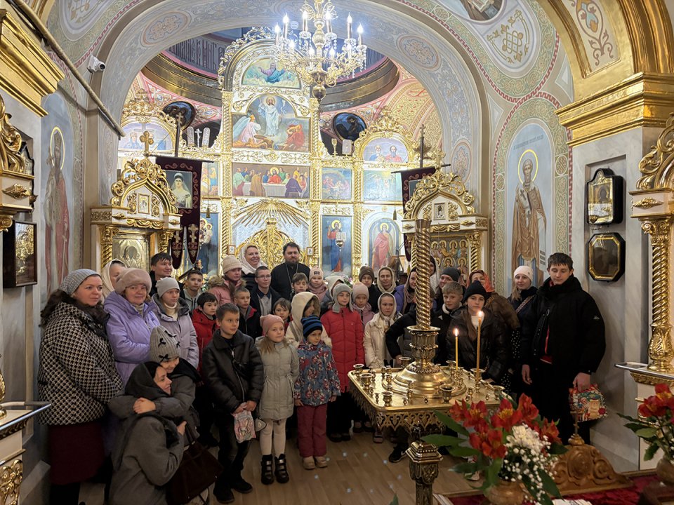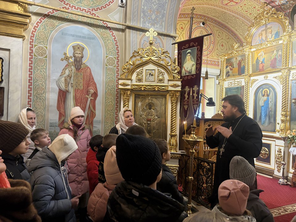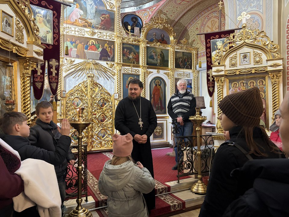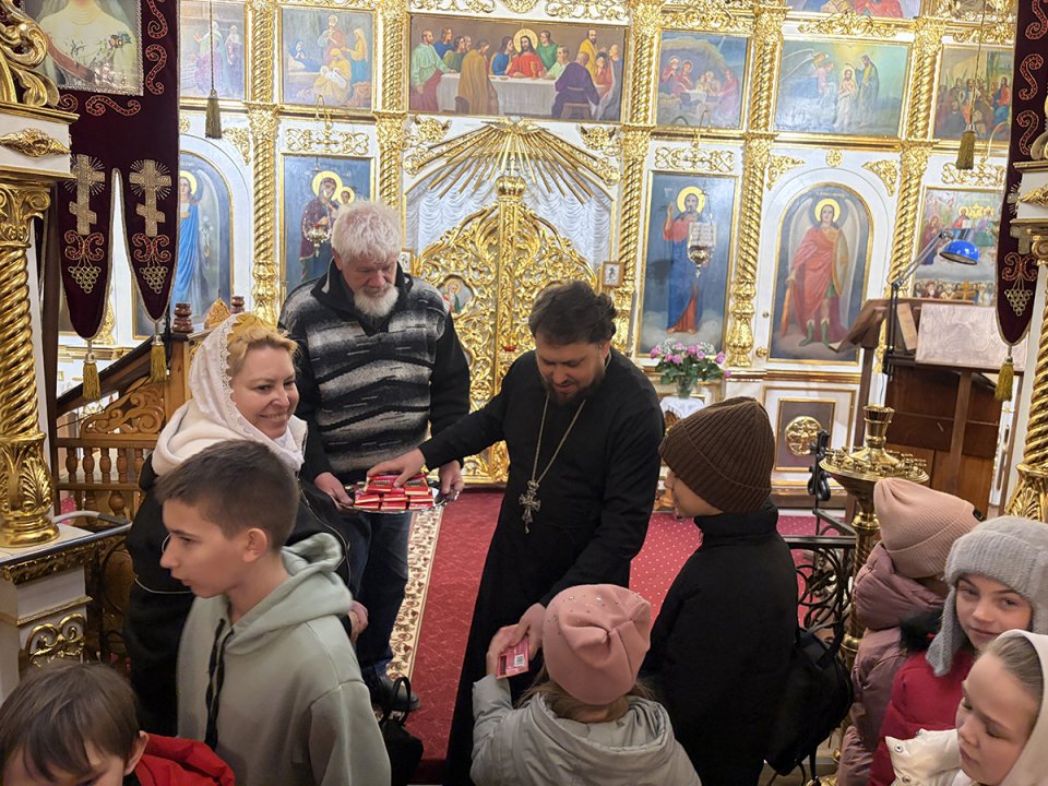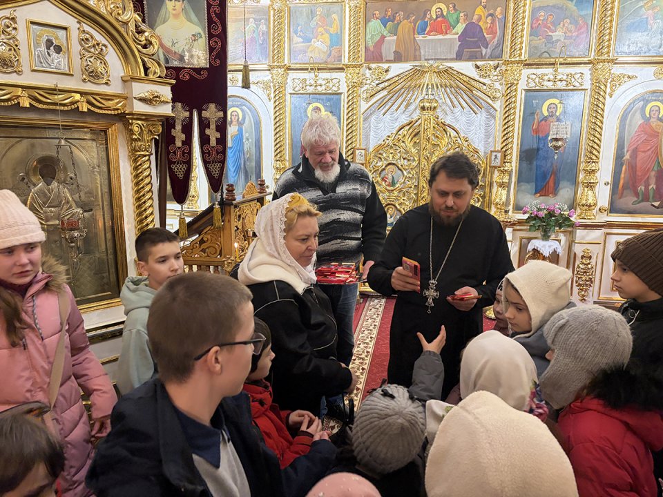 Далее все дружно переместились в сам храм, где всех радушно встретил его клирик, протоиерей Сергий Климачев. Батюшка поведал очень интересную и непростую историю церкви. После небольшой экскурсии отец Сергий вручил детям сладкие подарки.
