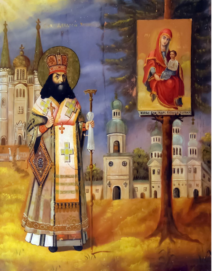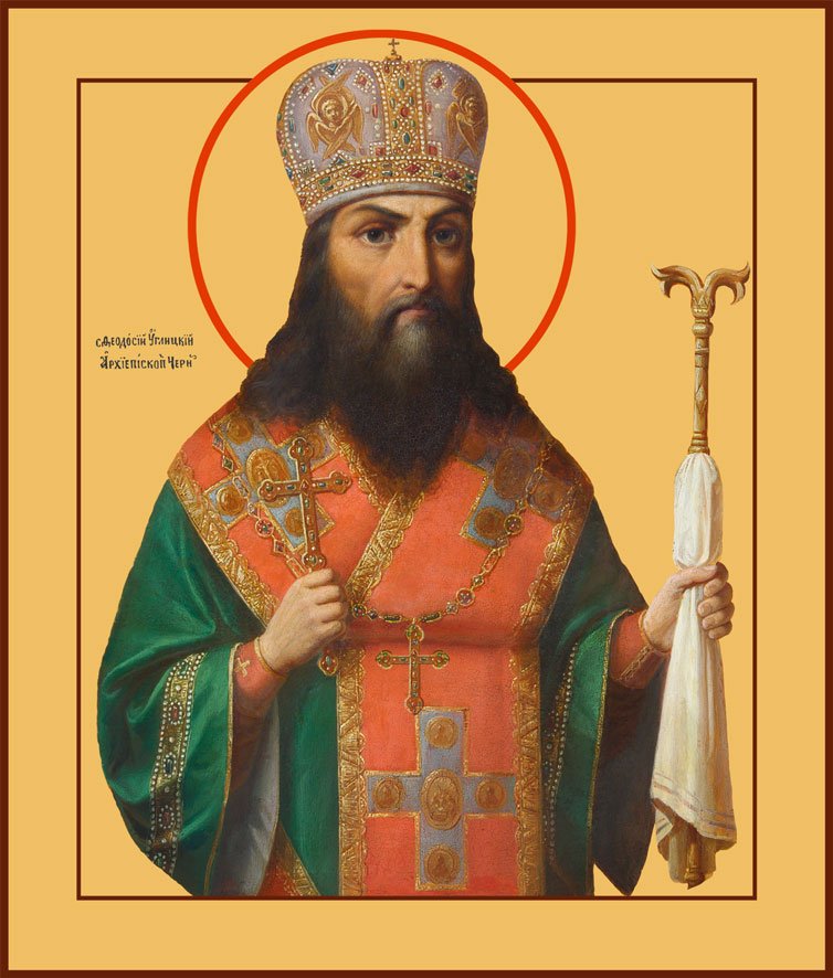 Свт. Феодосий, архиепископ Черниговский (1630-е – 1696), происходил из дворянского рода. Образование получил в Киево-Братской коллегии. Принял монашество в Киево-Печерской лавре. Был игуменом Киево-Выдубицкого монастыря, который восстановил после униатского разорения. С 1688 года – архимандрит Черниговского Елецкого монастыря. В 1692 году хиротонисан во архиепископа Черниговского. Проявил себя как мудрый архипастырь, ревнитель православия и устроитель монастырей. Особое внимание уделял духовному образованию и поддержанию благочестия. Скончался в 1696 году. Прославлен в лике святых в 1896 году.