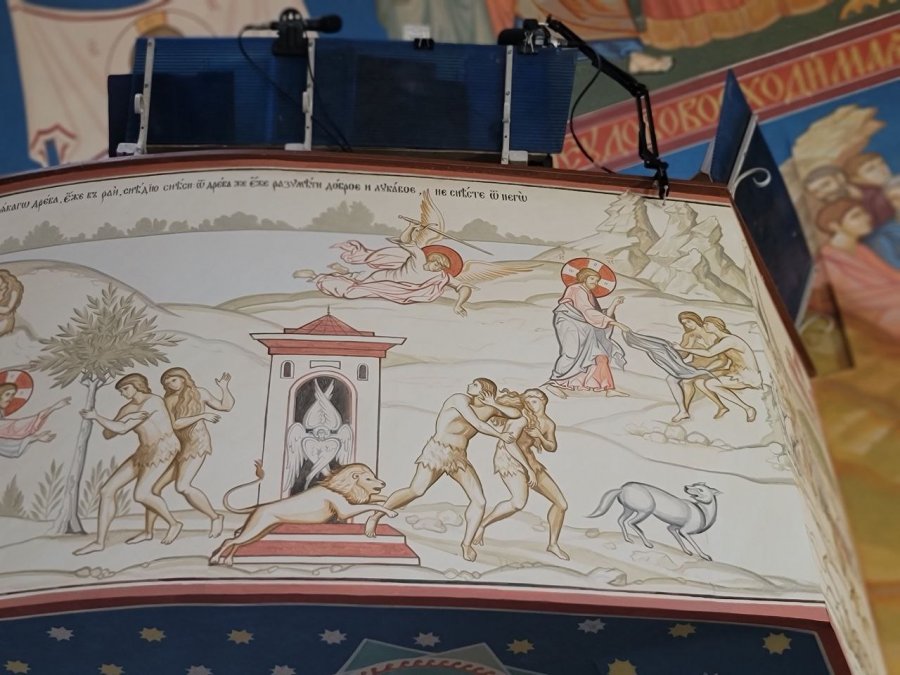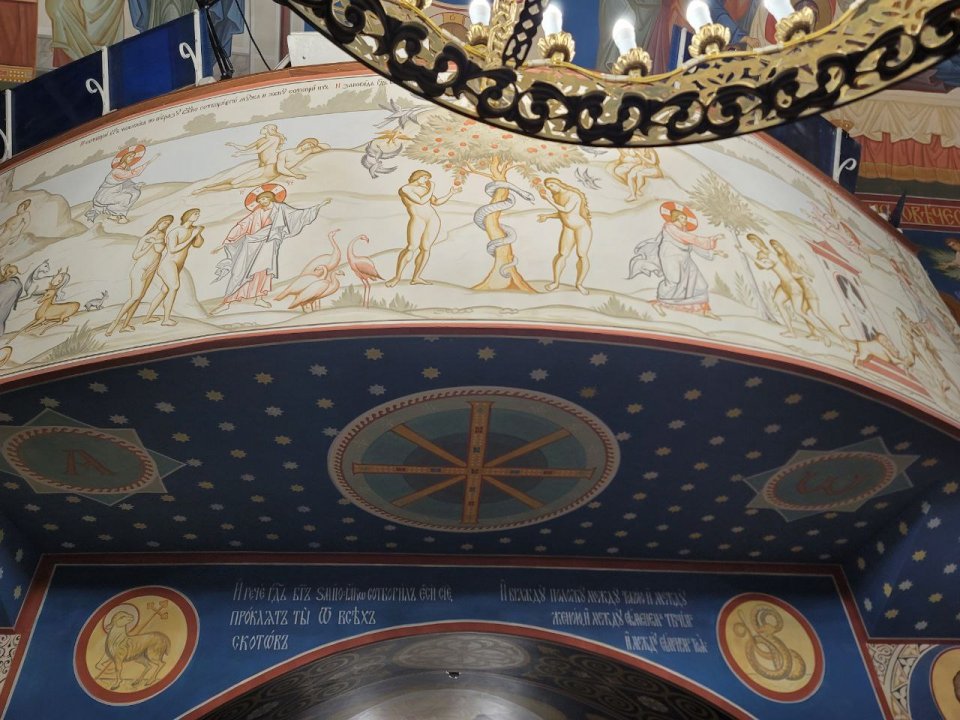 22 февраля, последнее воскресенье перед Великим постом – Прощеное воскресенье. В библейском смысле оно посвящено воспоминанию изгнания Адама из рая, поэтому хочется проиллюстрировать его фрагментом нашей росписи, которая как раз рассказывает о сотворении мира, грехопадении человека и изгнании первых людей из рая.