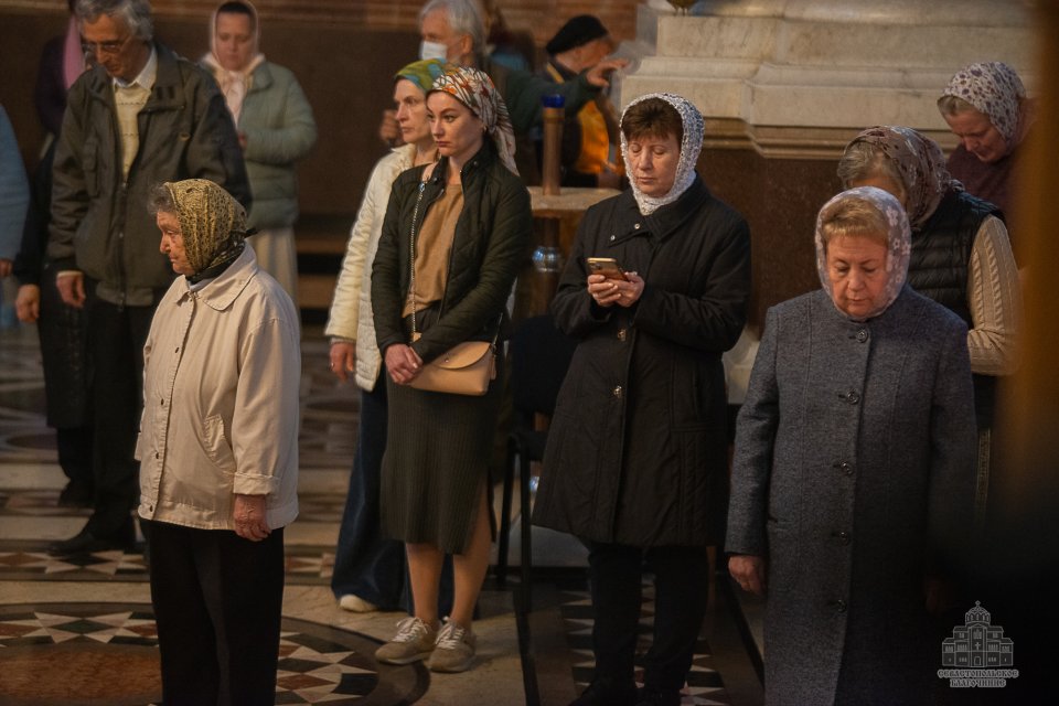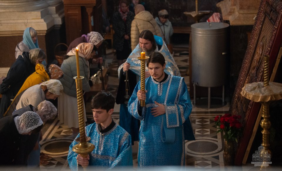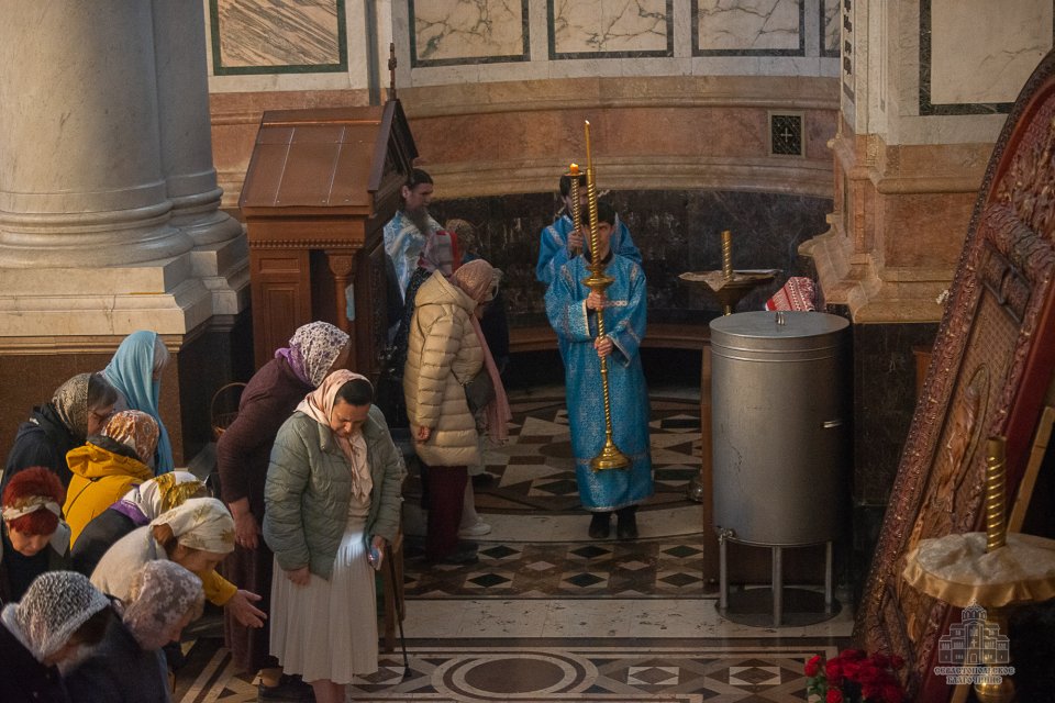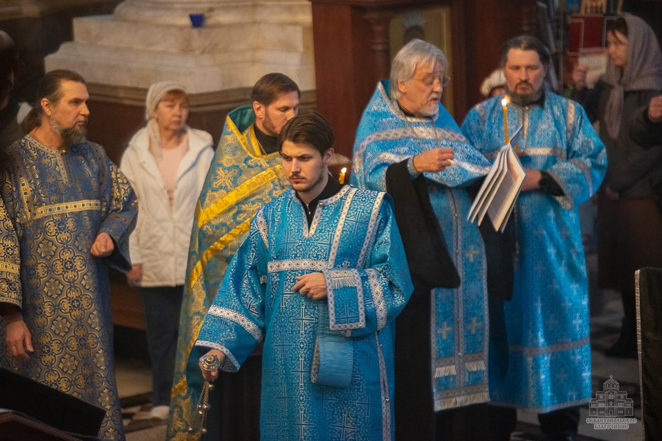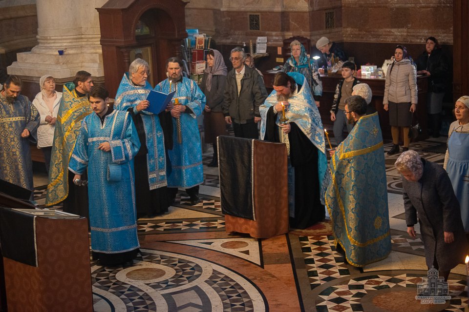 В субботу на пятой неделе Великого поста святая Церковь торжественно возглашает молебное пение акафиста, или благодарственной похвалы Пресвятой Богородице. Накануне, вечером в пятницу, праздничное богослужение с чтением Акафиста Божией Матери, совершил благочинный Центрального церковного округа протоиерей Сергий Халюта. Ему сослужило духовенство собора.