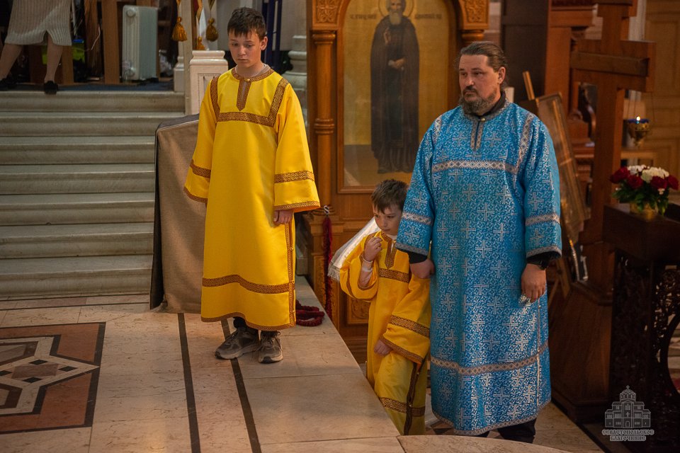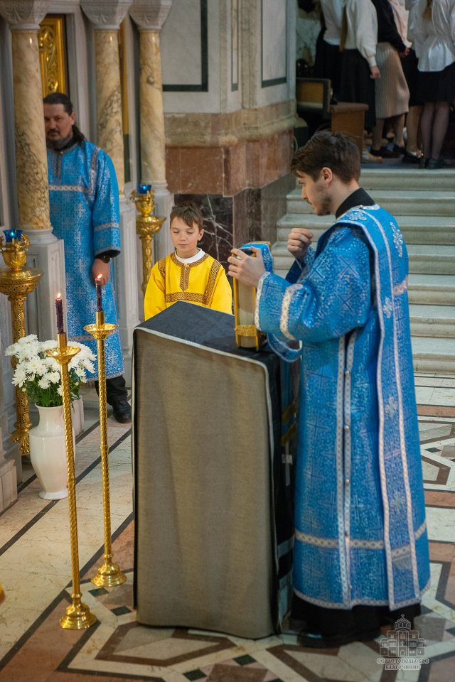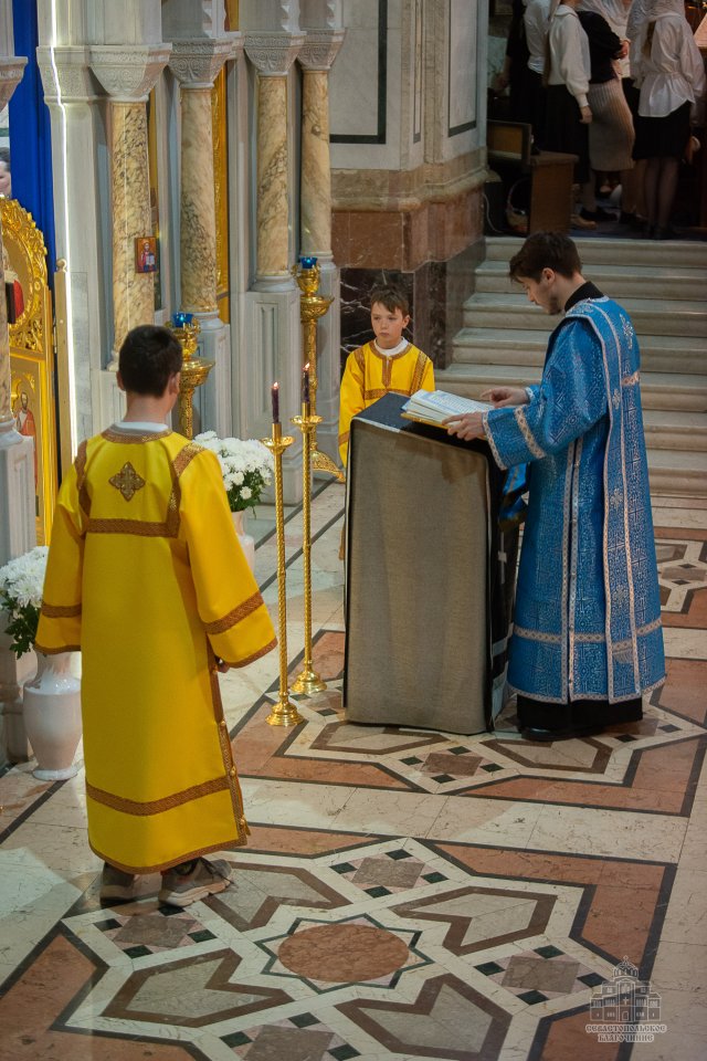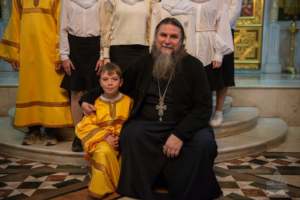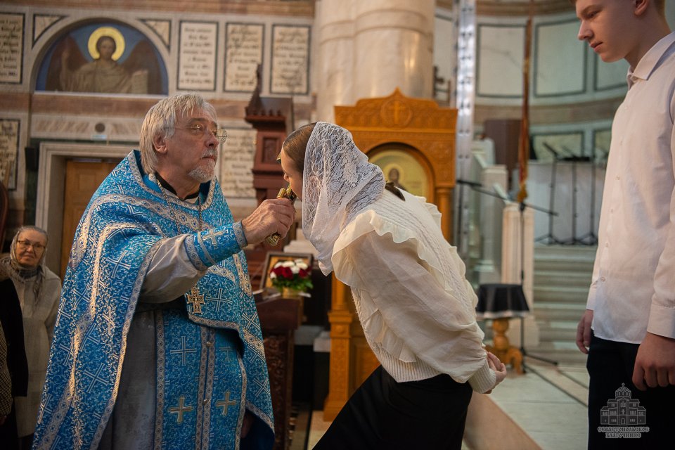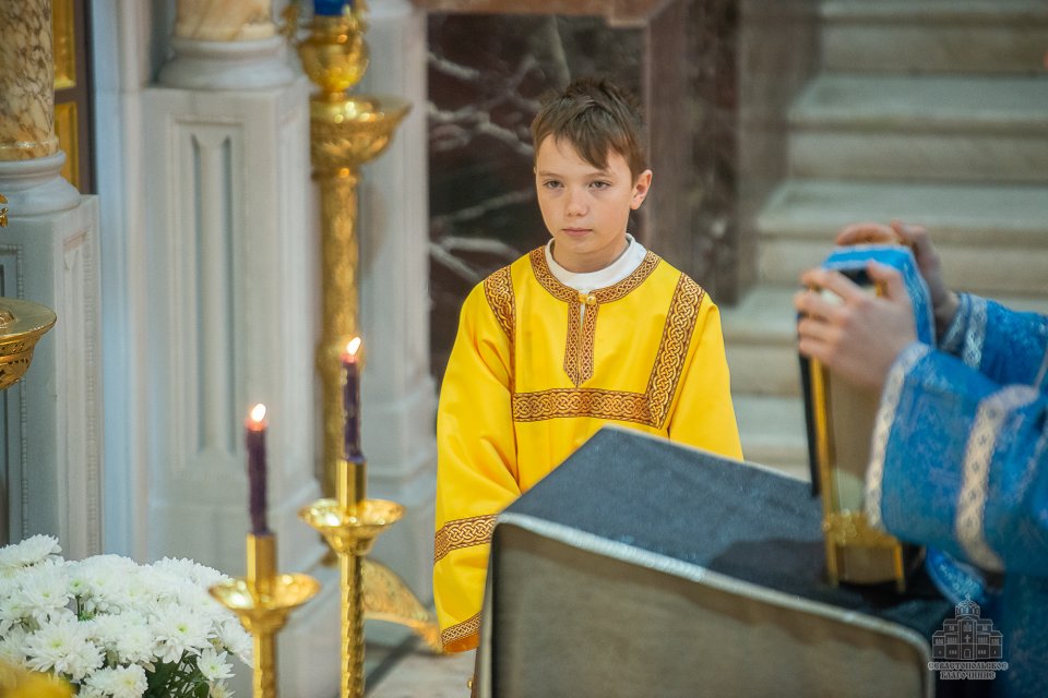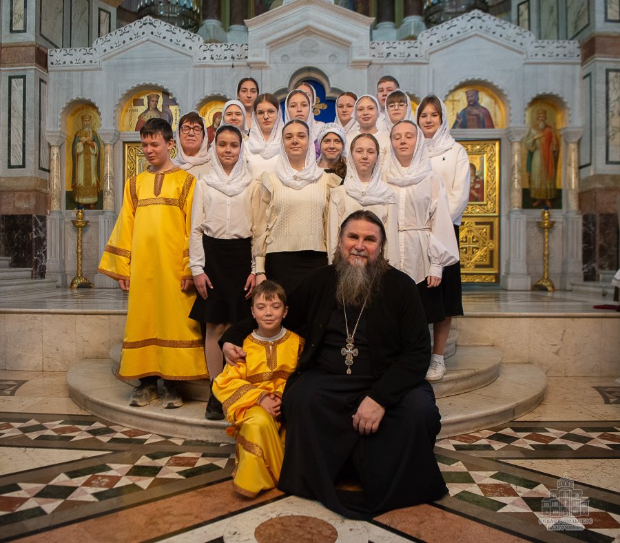 За богослужением, которое в сослужении духовенства возглавил настоятель собора - протоиерей Сергий Халюта, пел детский хор «Корсунь» собора (руководитель – Евгения Владимировна Тихова), а помогали священнослужителям в алтаре мальчики, которые проходят обучение в школе пономарей при соборе. Ребята очень старались, и все получилось очень достойно, благолепно и красиво. Хор создавал особую молитвенную атмосферу, которую прочувствовали верующие, пришедшие в храм помолиться.