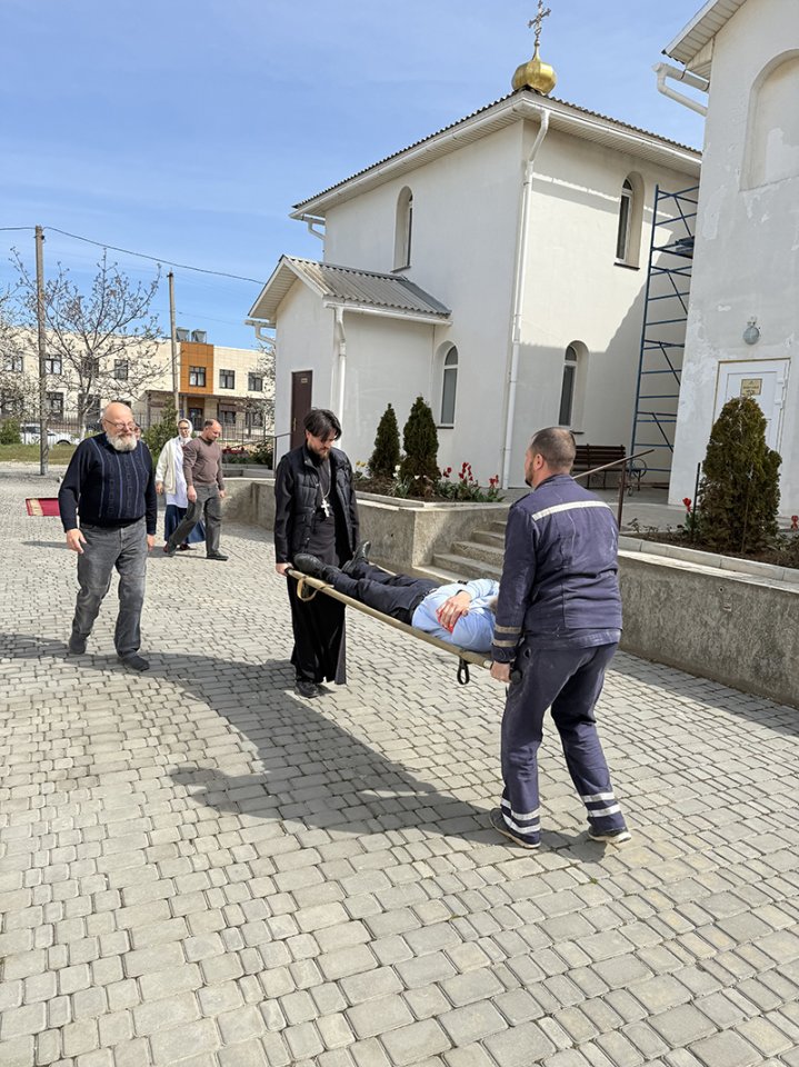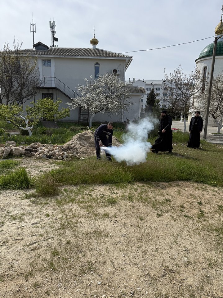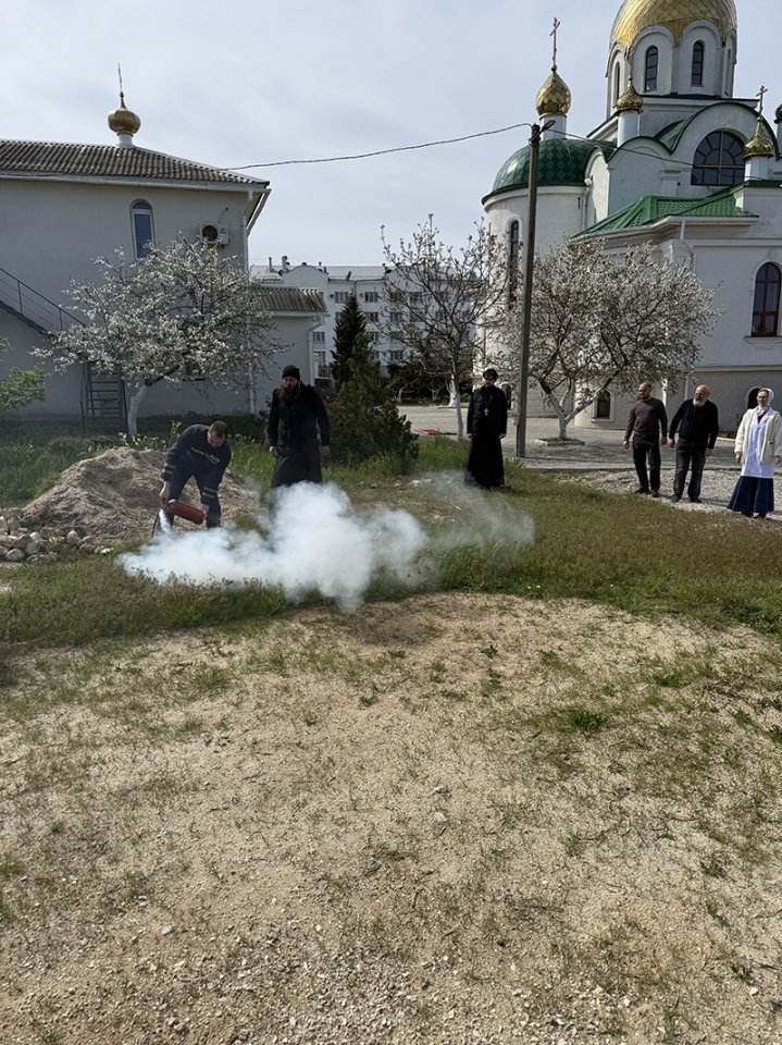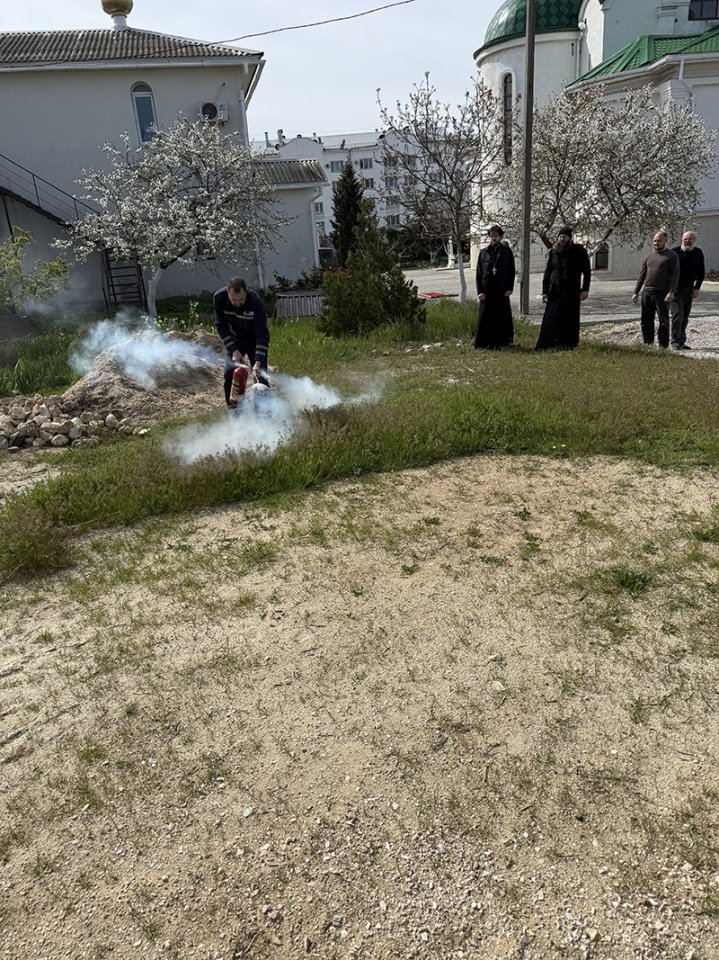 Вызваны спасательные службы, силами имеющихся медиков из числа сотрудников храма была оказана компетентная медицинская помощь условно раненному и эвакуированному человеку. После оказания первой медицинской помощи пострадавший был перенесён в карету скорой помощи. Завершились тренировочные занятия фактическим тушением условного возгорания на территории храма.