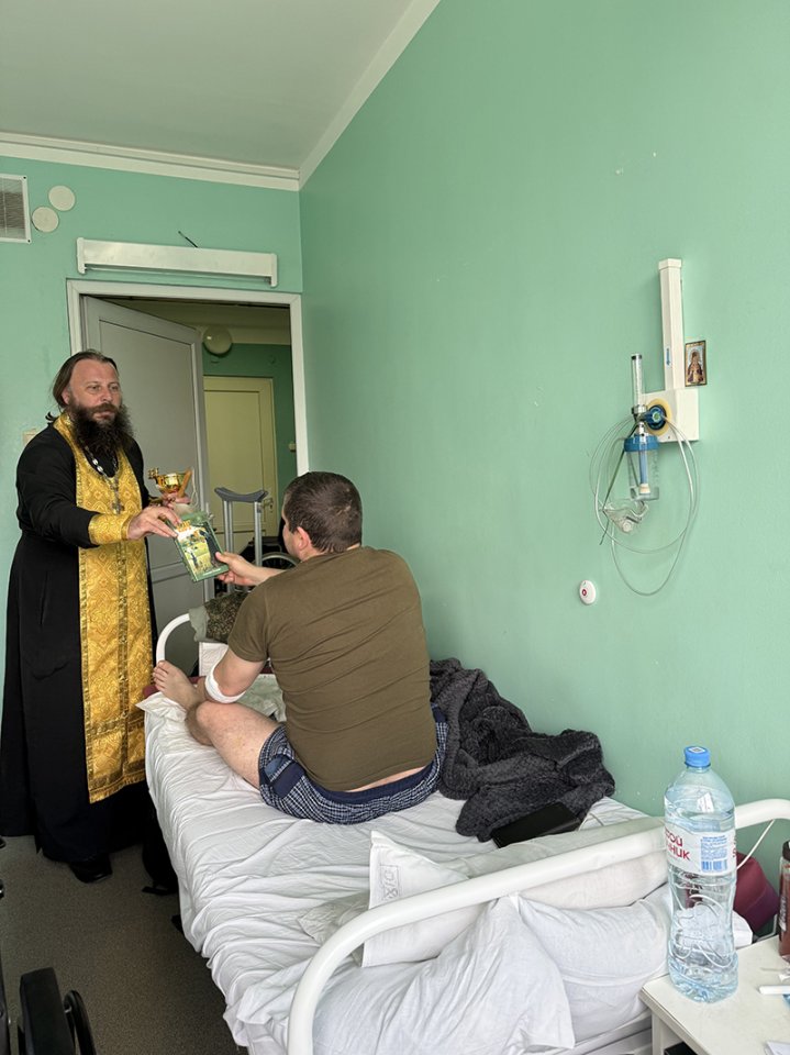 Продолжились содержательные будни храма традиционным пастырским посещением военного госпиталя, где, попалатно, каждому воину было преподано пасхальное слово проповеди, кропление святой крещенской водой и целебное помазание благодатным елеем. А временно недвижимым был передан «Лучший Подарок» – Книга!