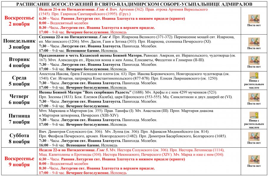 Расписание богослужений в Свято-Владимирском соборе-усыпальнице адмиралов с 2 по 9 ноября