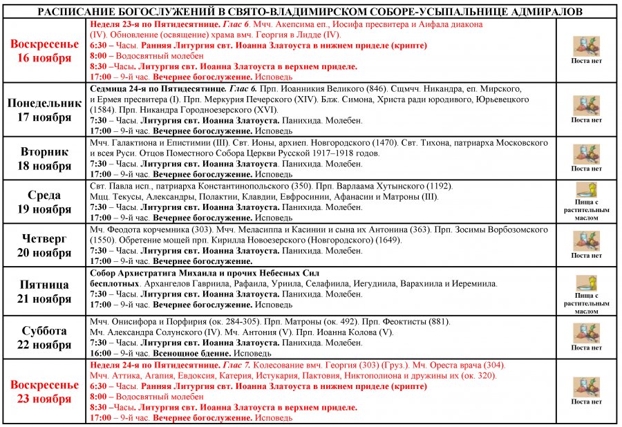 Расписание богослужений в Свято-Владимирском соборе-усыпальнице адмиралов с 16 по 23 ноября