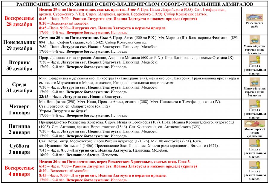 Расписание богослужений в Свято-Владимирском соборе-усыпальнице адмиралов с 28 декабря по 4 января