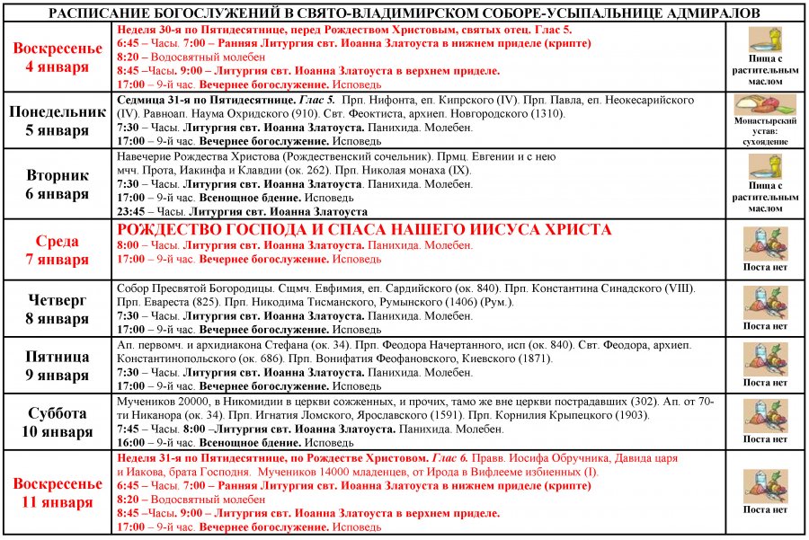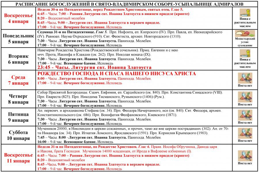 Расписание богослужений в Свято-Владимирском соборе-усыпальнице адмиралов с 4 по 11 января