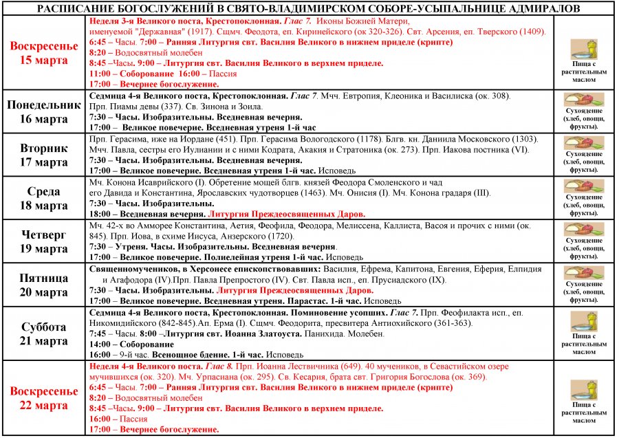 Расписание богослужений в Свято-Владимирском соборе-усыпальнице адмиралов с 15 по 22 марта