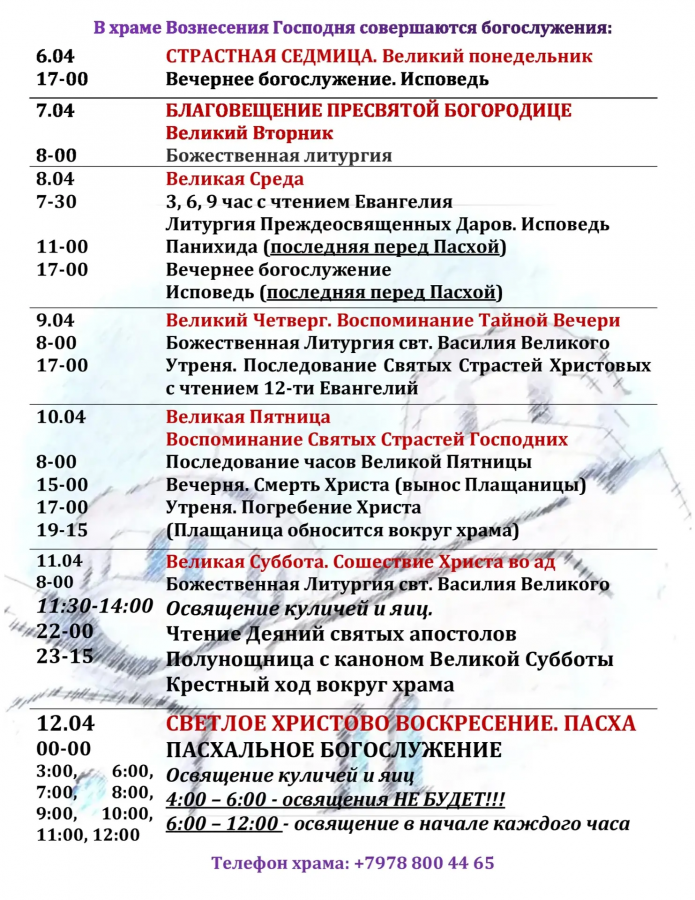 Расписание богослужений на Страстной Седмице и в праздник Светлого Христова Воскресения в храме Вознесения Господня