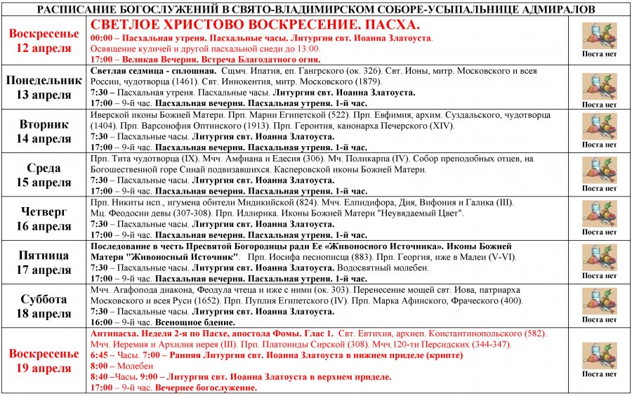 Расписание богослужений в Свято-Владимирском соборе-усыпальнице адмиралов с 12 по 19 апреля. Светлая седмица