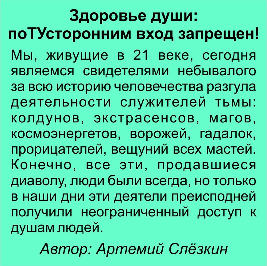 Здоровая душа – это душа, отданная в руки Божии. Сохранить здоровье души непросто, слишком много грязных рук тянется к этой бесценной жемчужине. Отдать ее в эти руки или, призывая на помощь Господа, отстоять – свободно решает каждый сам. Чтобы не погибнуть навеки, закроем в свою душу вход злым, поТУсторонним силам. С нами Бог и никакие падшие духи нам не повредят… если мы сами этого не захотим!
