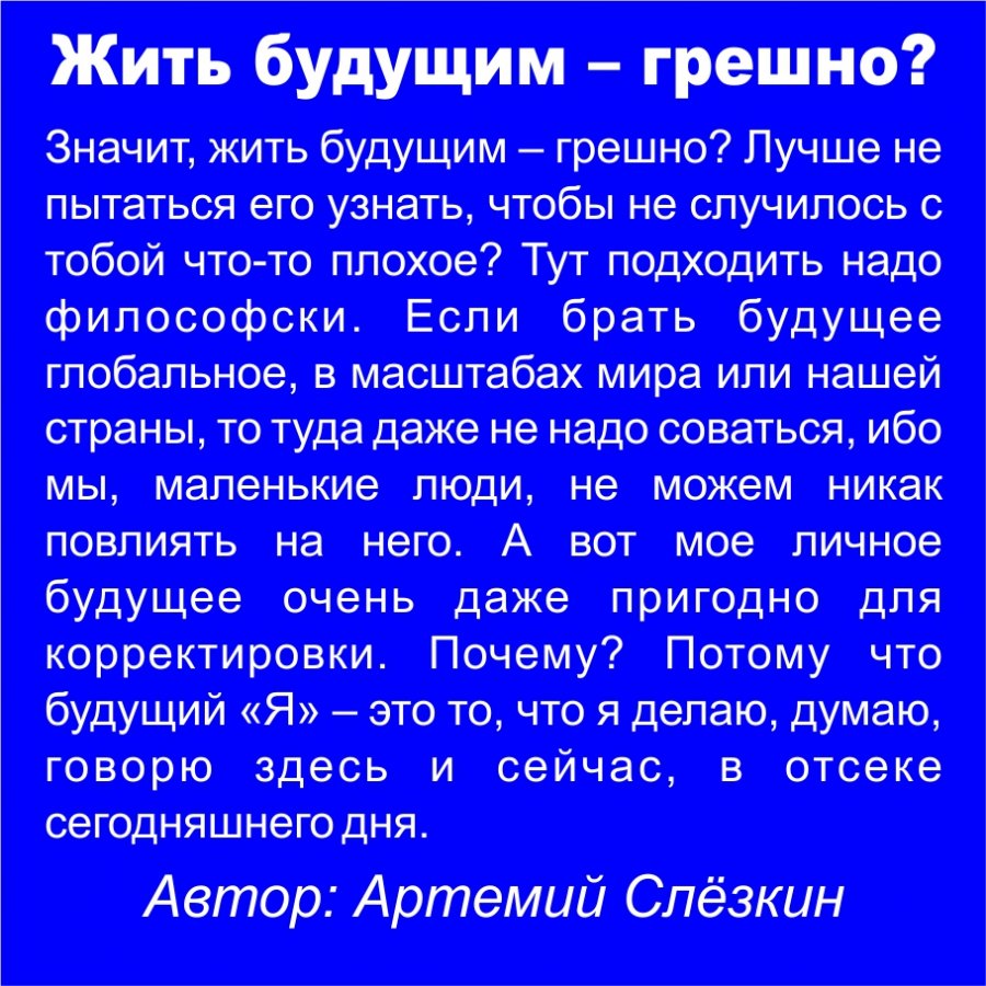 Значит, жить будущим – грешно? Лучше не пытаться его узнать, чтобы не случилось с тобой что-то плохое? Тут подходить надо философски. Если брать будущее глобальное, в масштабах мира или нашей страны, то туда даже не надо соваться, ибо мы, маленькие люди, не можем никак повлиять на него. А вот мое личное будущее очень даже пригодно для корректировки. Почему? Потому что будущий «Я» – это то, что я делаю, думаю, говорю здесь и сейчас, в отсеке сегодняшнего дня.