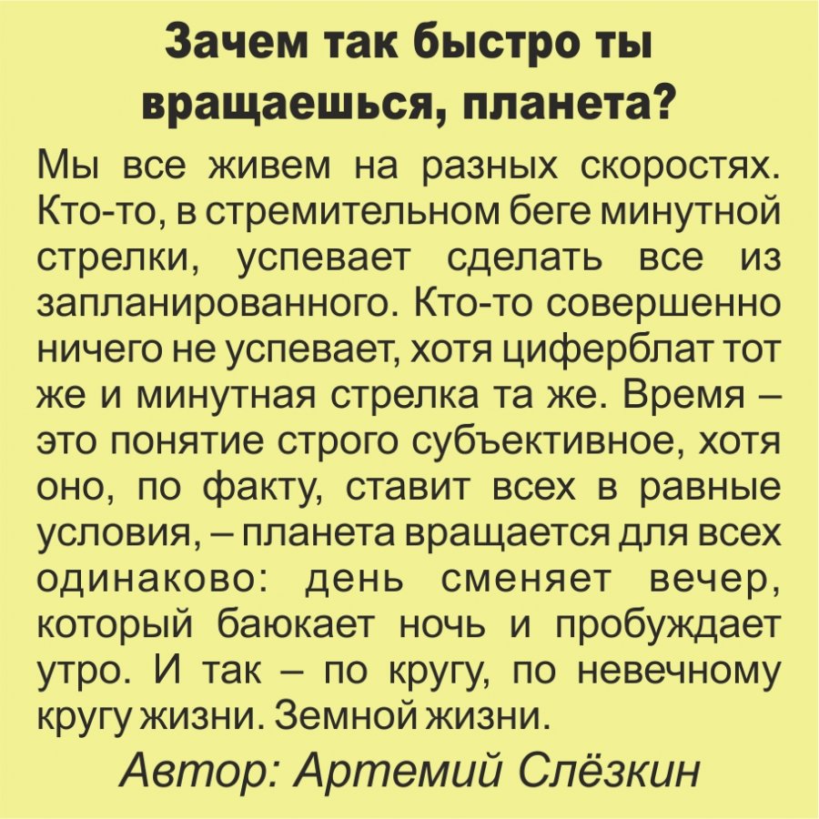 Мы все живем на разных скоростях. Кто-то, в стремительном беге минутной стрелки, успевает сделать все из запланированного. Кто-то совершенно ничего не успевает, хотя циферблат тот же и минутная стрелка та же. Время – это понятие строго субъективное, хотя оно, по факту, ставит всех в равные условия, – планета вращается для всех одинаково: день сменяет вечер, который баюкает ночь и пробуждает утро. И так – по кругу, по невечному кругу жизни. Земной жизни.