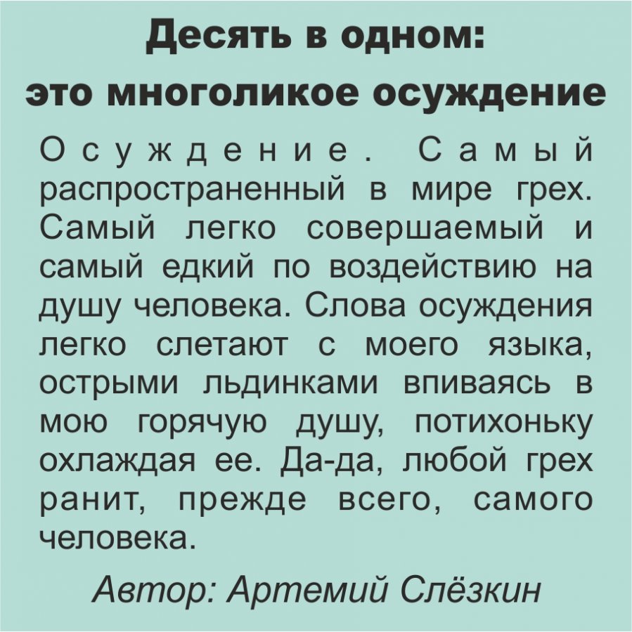 Осуждение. Самый распространенный в мире грех. Самый легко совершаемый и самый едкий по воздействию на душу человека. Слова осуждения легко слетают с моего языка, острыми льдинками впиваясь в мою горячую душу, потихоньку охлаждая ее. Да-да, любой грех ранит, прежде всего, самого человека. А рана от осуждения сильна в десятикратном размере. Если разобрать «на атомы» грех осуждения, то можно насчитать как минимум десять других грехов, служащих либо источником, либо следствием греха осуждения. Итак, начнем?