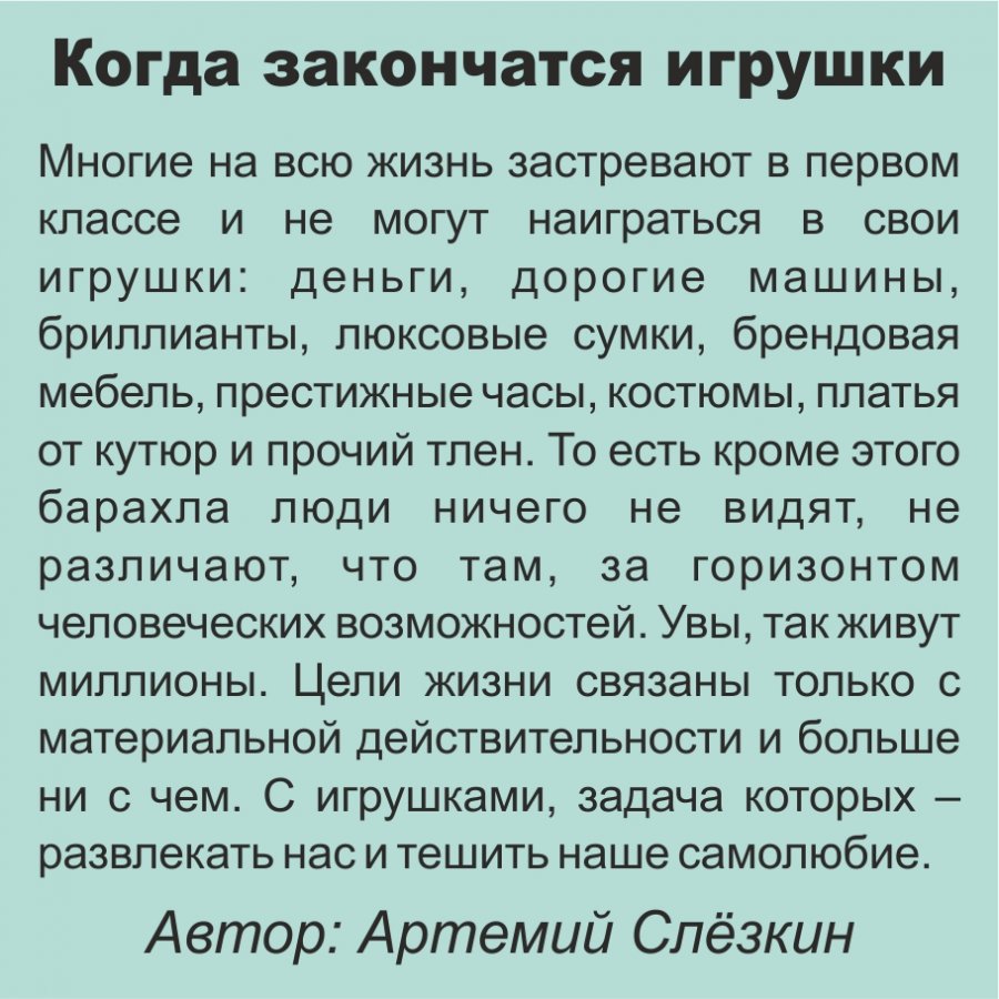 Многие на всю жизнь застревают в первом классе и не могут наиграться в свои игрушки: деньги, дорогие машины, бриллианты, люксовые сумки, брендовая мебель, престижные часы, костюмы, платья от кутюр и прочий тлен. То есть кроме этого барахла люди ничего не видят, не различают, что там, за горизонтом человеческих возможностей. Увы, так живут миллионы. Цели жизни связаны только с материальной действительности и больше ни с чем. С игрушками, задача которых – развлекать нас и тешить наше самолюбие.